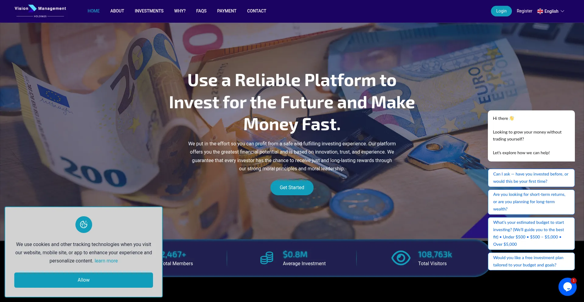 Visionmanagementholdings.com 运营欺诈性金融平台,推广具有不现实回报承诺的欺骗性投资机会。安全分析表明该平台采用与 庞氏骗局 和预付费欺诈一致的策略,旨在提取用户资金和个人信息。