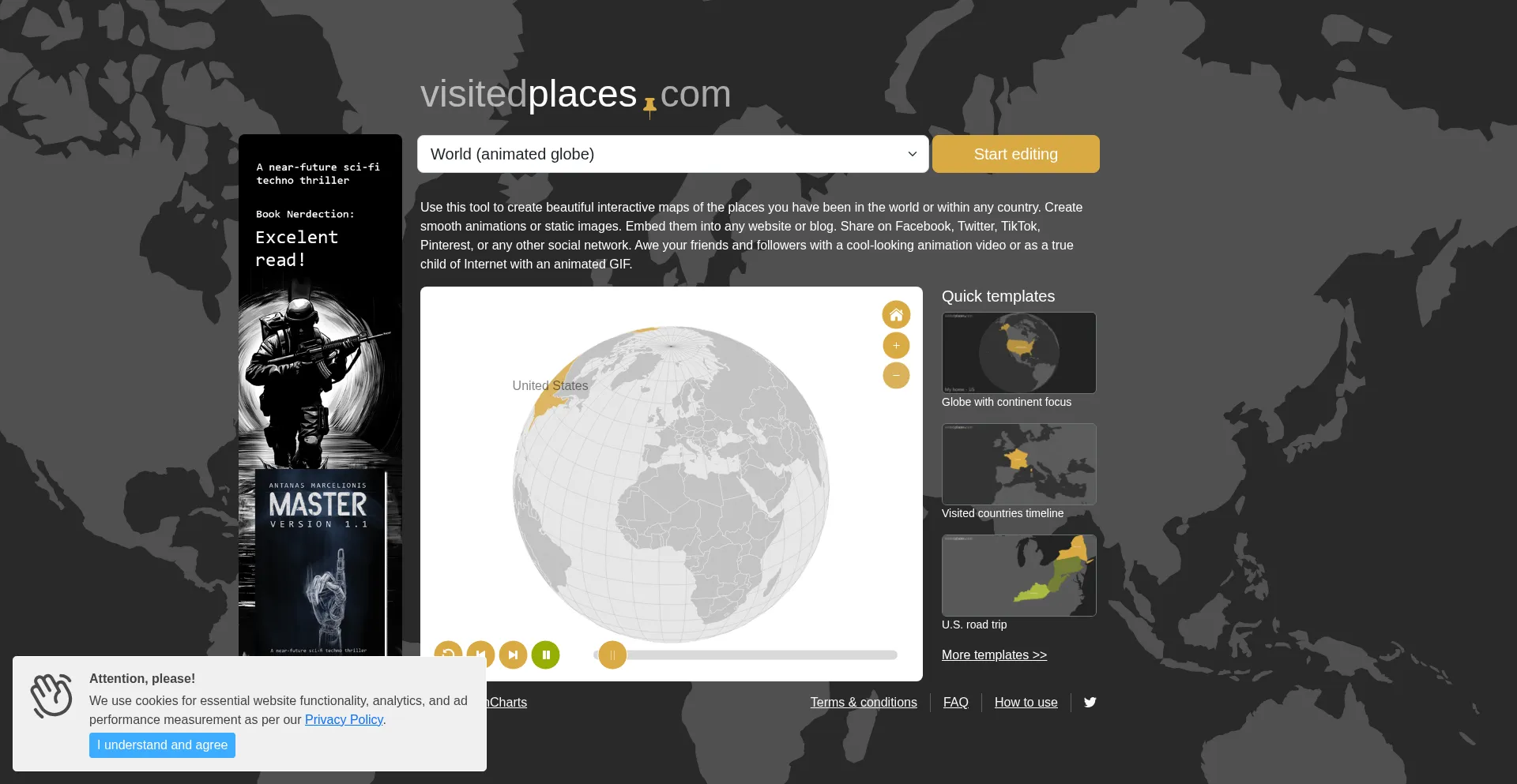 Make your own interactive visited countries map. Select, configure, share, download, make a cool video.