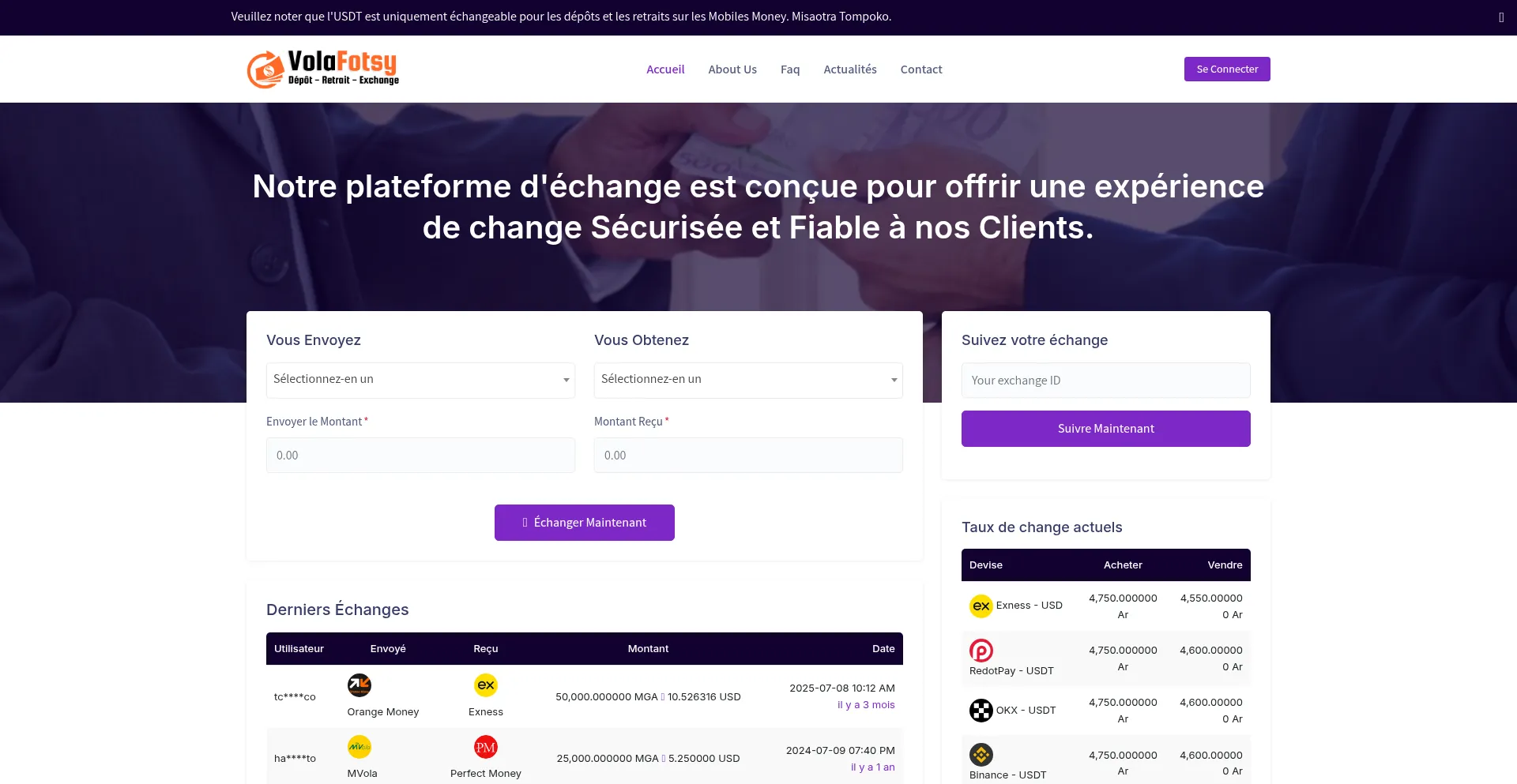 Volafotsy est une plateforme d'échange de devises en cryptomonnaies qui permet aux utilisateurs de convertir leurs devises traditionnelles en monnaies numériques. Vous cherche...