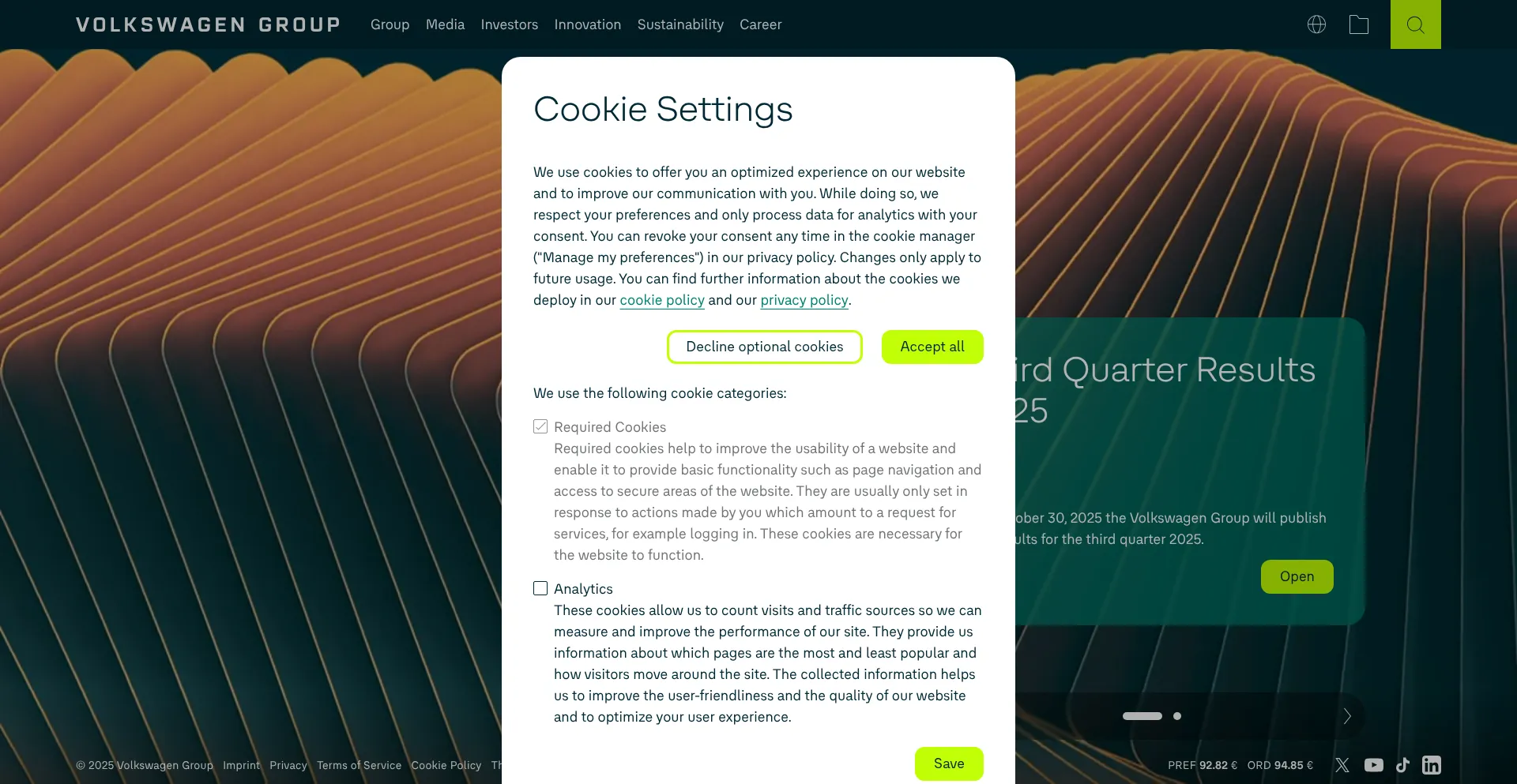 该网站实现符合GDPR或CCPA等隐私法规的cookie同意机制。这表明 volkswagen-group.com 遵守数据保护标准并为用户提供对个人数据收集实践的控制。