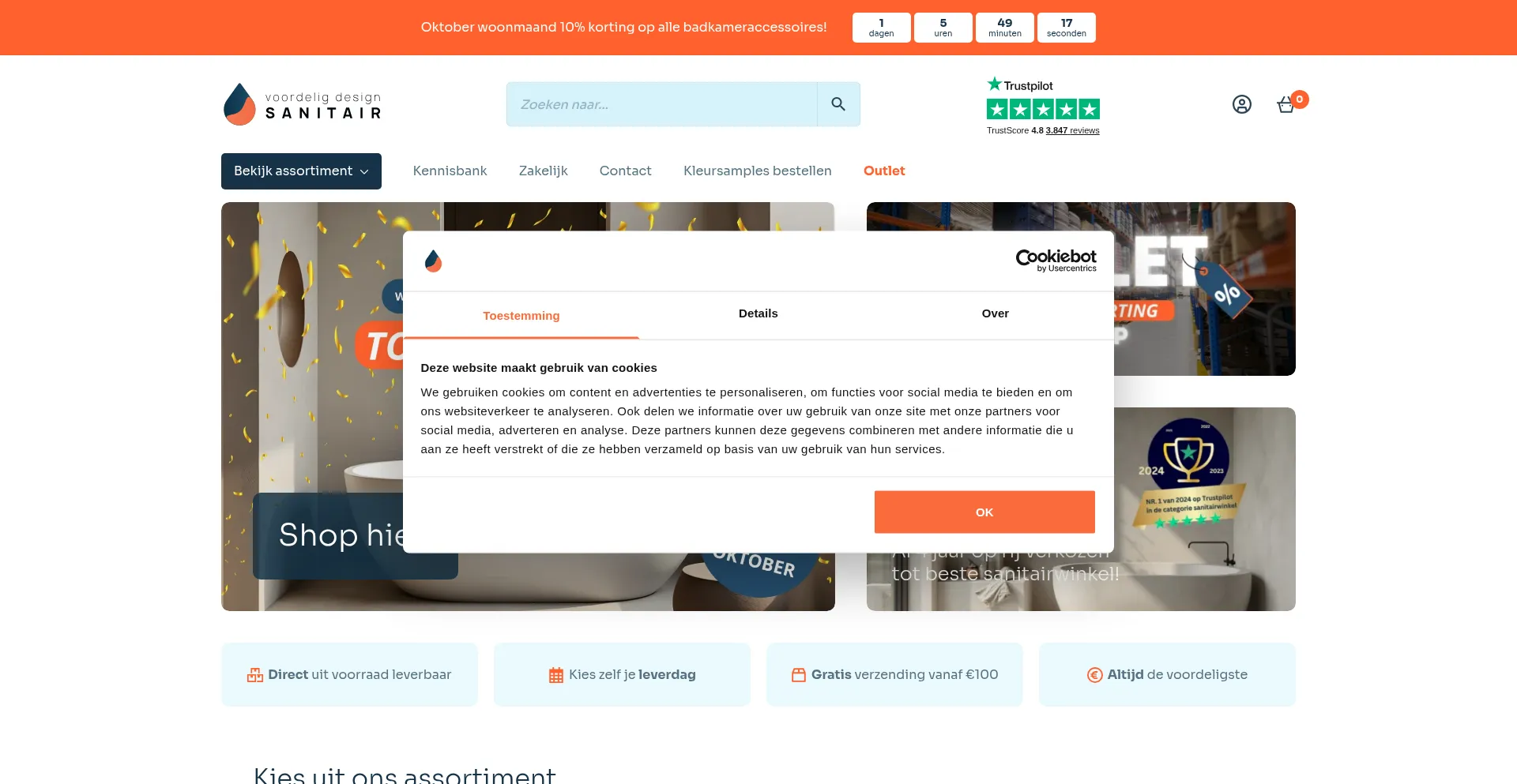 该网站实现符合GDPR或CCPA等隐私法规的cookie同意机制。这表明 voordeligdesignsanitair.nl 遵守数据保护标准并为用户提供对个人数据收集实践的控制。