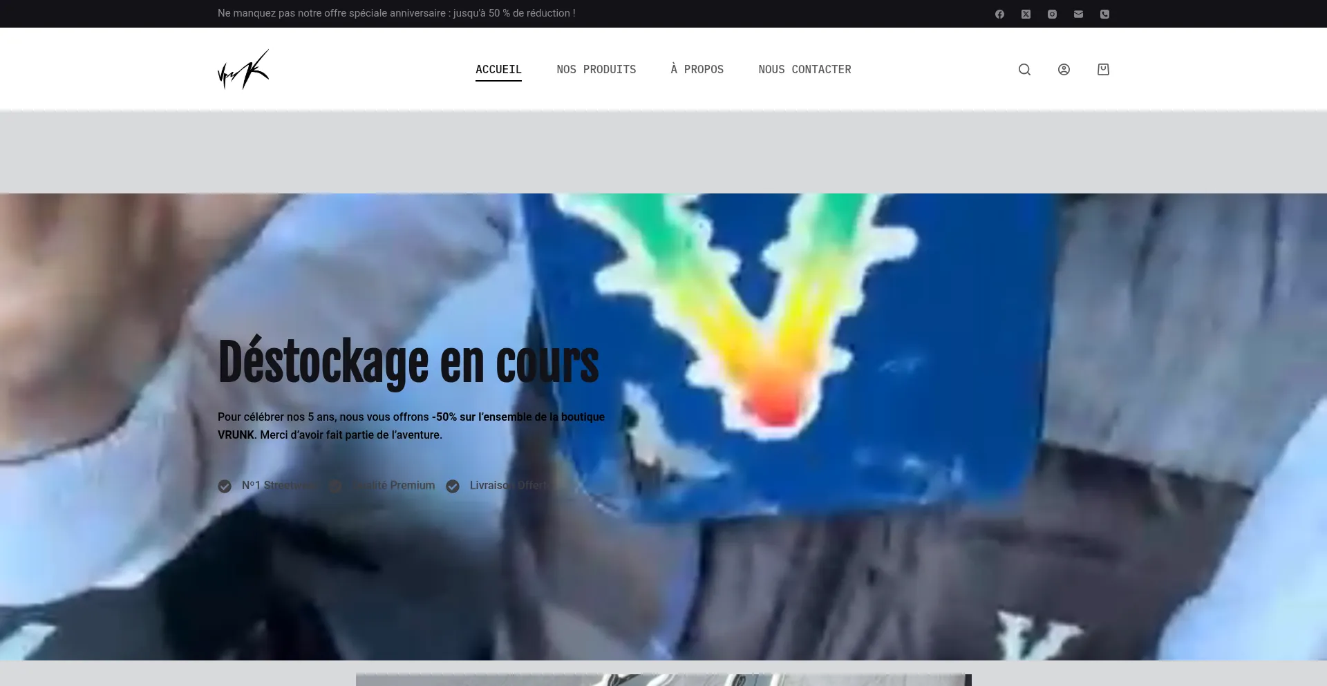 Déstockage en cours Pour célébrer nos 5 ans, nous vous offrons -50% sur l’ensemble de la boutique VRUNK. Merci d’avoir fait partie de l’aventure. Nº1 Streetwear Qualit...
