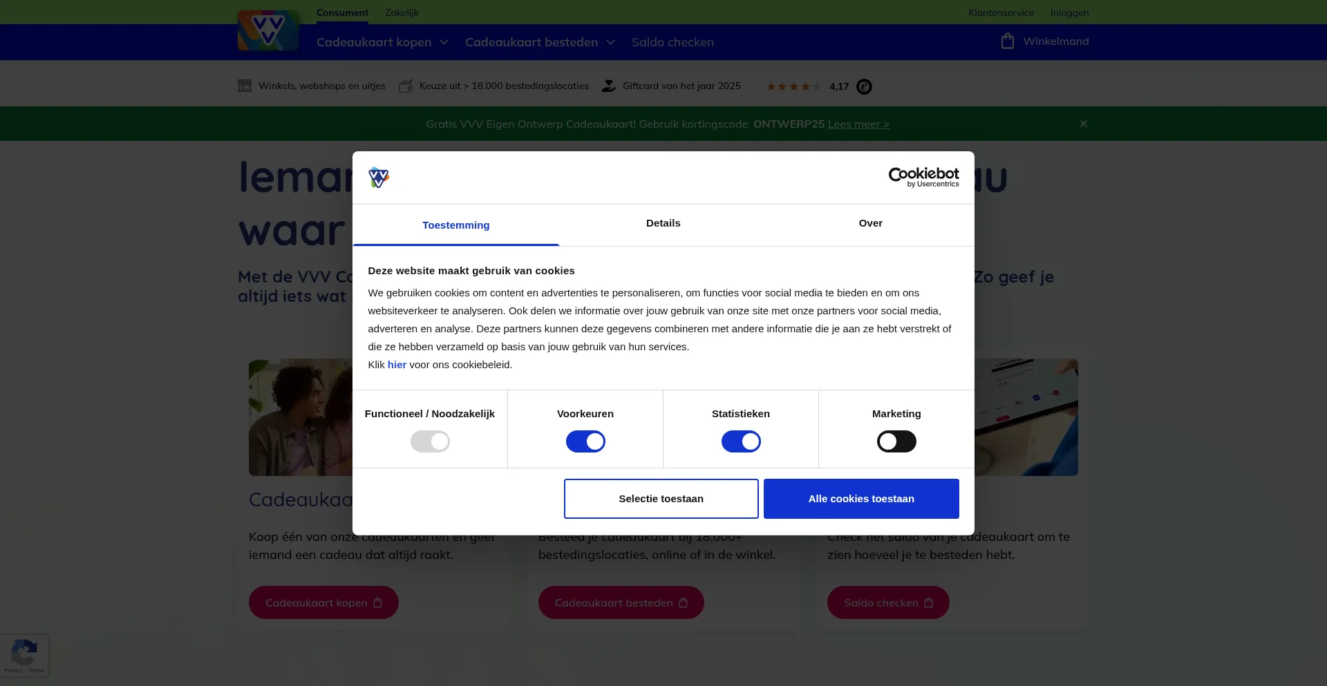 该网站实现符合GDPR或CCPA等隐私法规的cookie同意机制。这表明 vvvcadeaukaarten.nl 遵守数据保护标准并为用户提供对个人数据收集实践的控制。