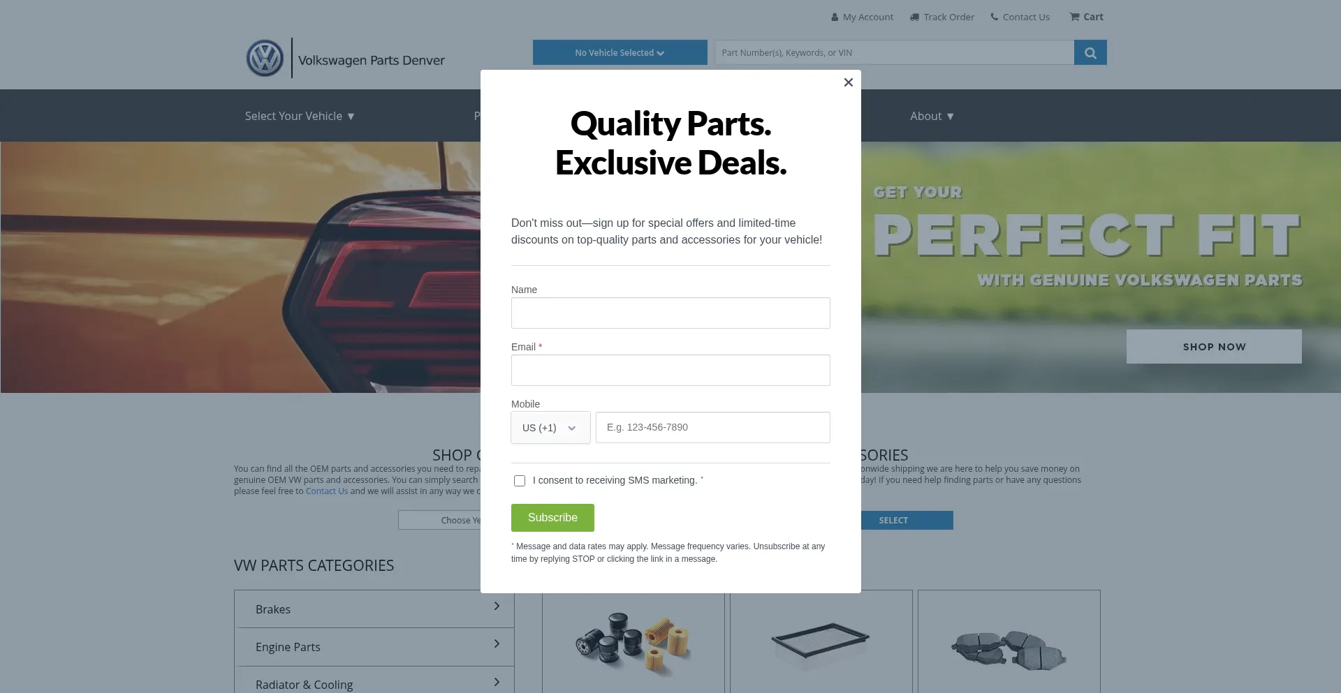 该网站实现数据收集表单,请求个人信息,包括姓名、电子邮件地址、电话号码或其他敏感详细信息。用户应验证 vwpartsdenver.com 的合法性并在提交个人数据前查看隐私政策。