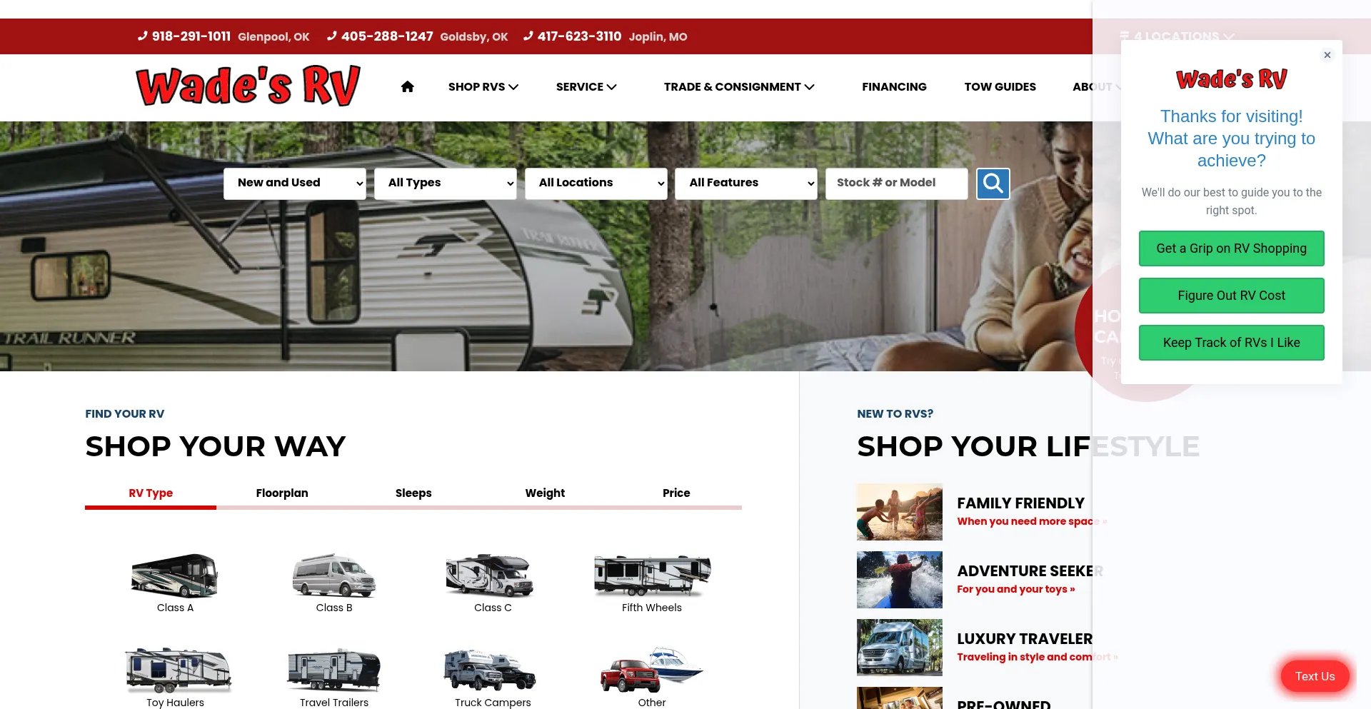 Wade's RV is your local RV Dealer in OK and MO. We have some of the top brand name RVs for sale at incredible prices. Stop in today to see all our RVs at one of our locations in...