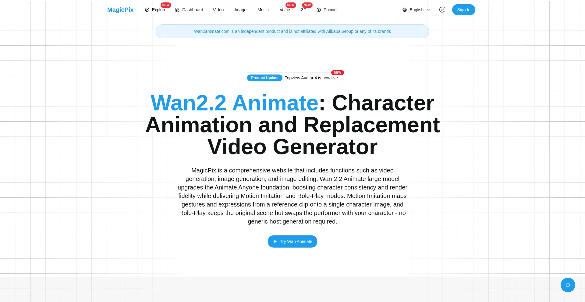 Wan2.2 Animate is a powerful character replacement video generator that swaps clip characters - just upload a photo and video to create consistent motion.