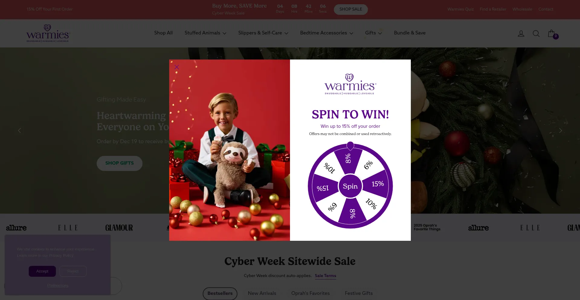 该网站实现符合GDPR或CCPA等隐私法规的cookie同意机制。这表明 warmies.com 遵守数据保护标准并为用户提供对个人数据收集实践的控制。
