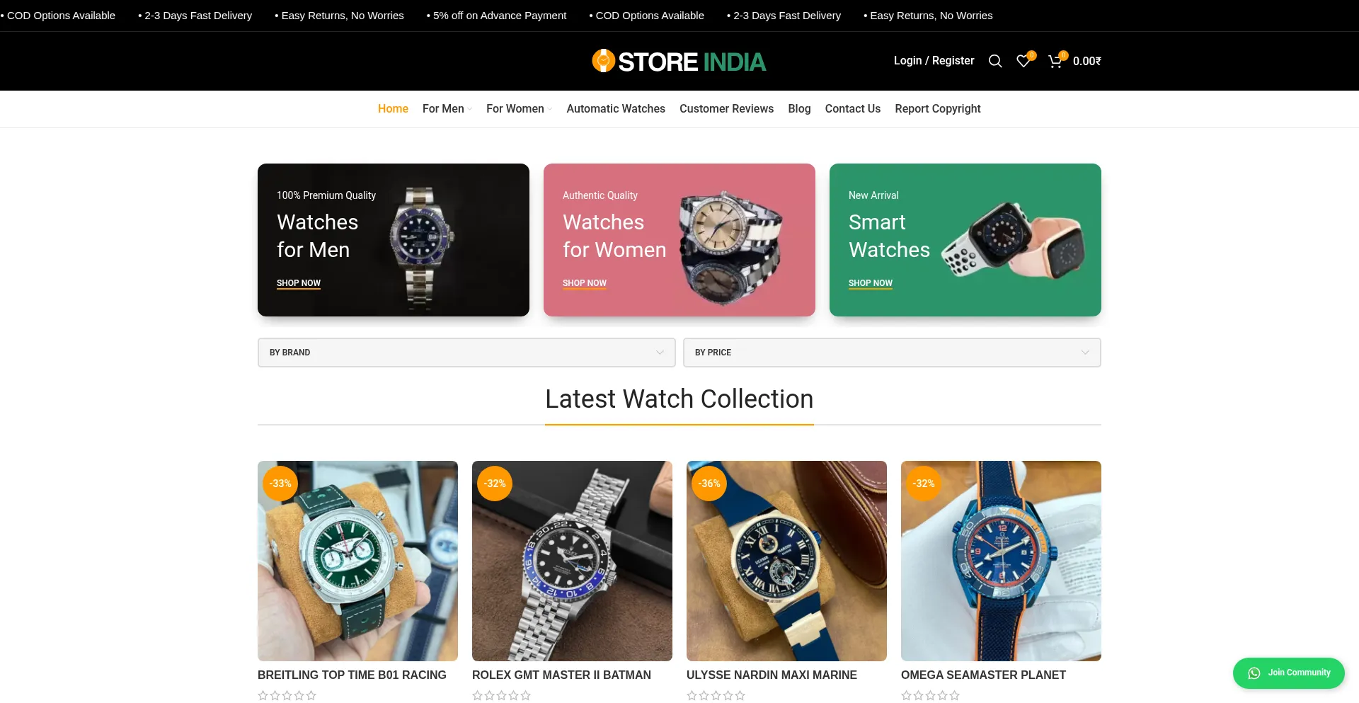 分析表明 watchstoreindia.com 作为电子商务平台运营,促进商品或服务的在线交易。该网站实现了购物车功能、支付处理系统和产品目录功能,这些是商业零售运营的典型特征。