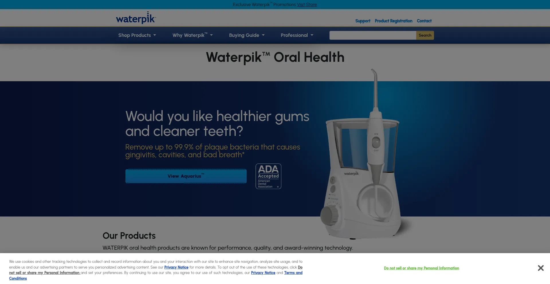 该网站实现符合GDPR或CCPA等隐私法规的cookie同意机制。这表明 waterpik.com 遵守数据保护标准并为用户提供对个人数据收集实践的控制。