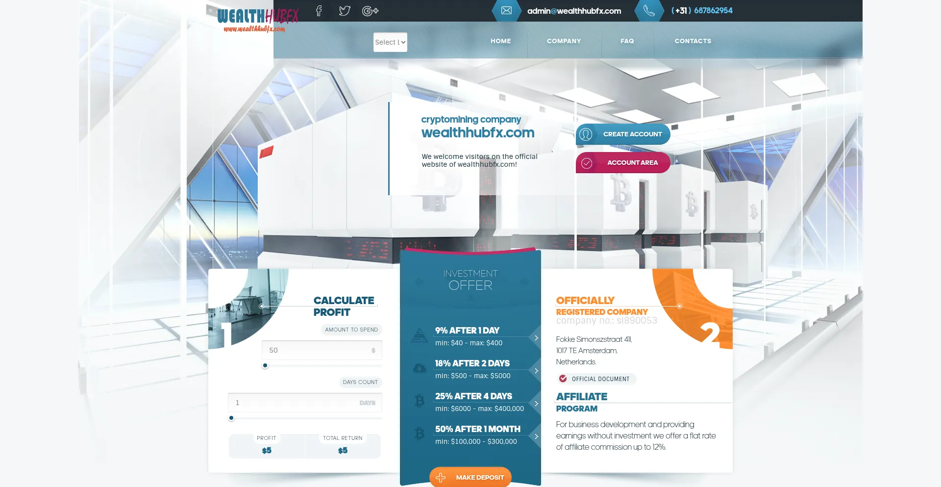 分析显示 wealthhubfx.com 显示社交媒体图标或链接,但不连接到合法的社交媒体档案。这种欺骗性做法通常用于创造虚假合法性,代表需要立即谨慎的欺诈意图的重要指标。
