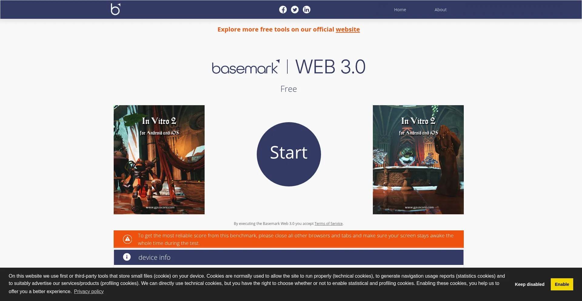 网站上存在社交媒体链接表明 web.basemark.com 在社交媒体上维护官方账户,这是可信度和参与度的积极信号。