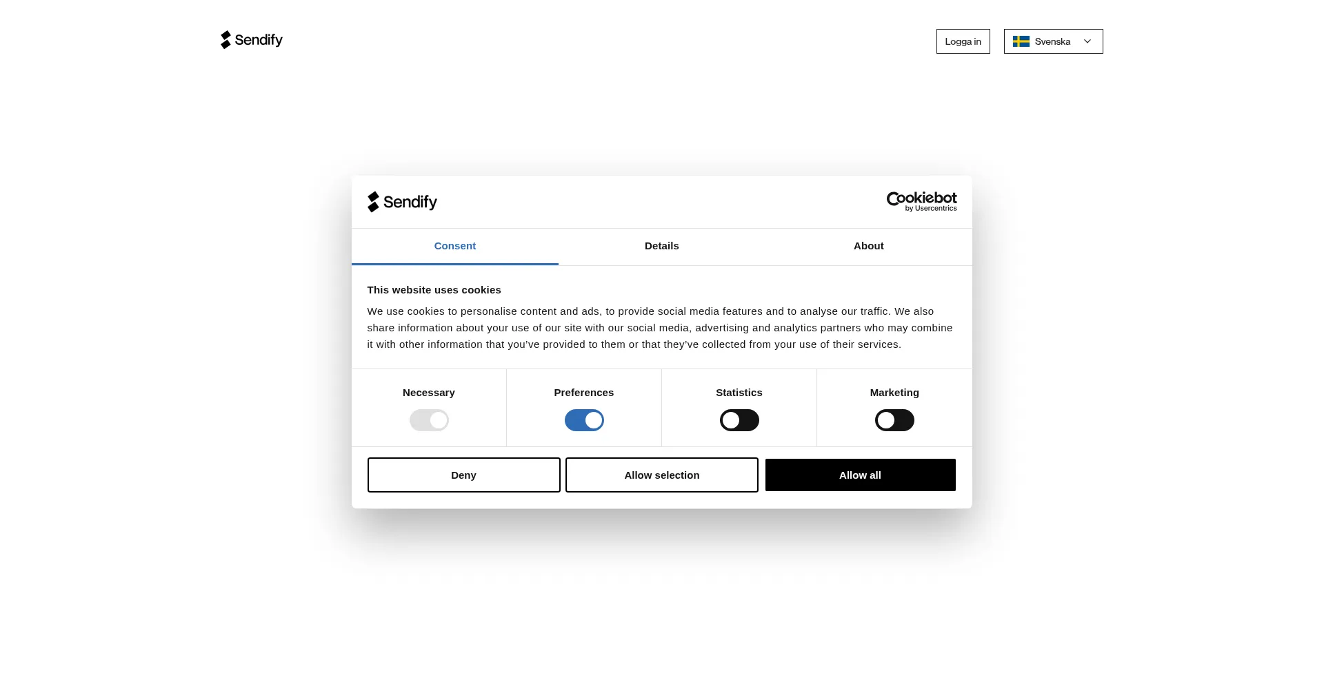 该网站实现符合GDPR或CCPA等隐私法规的cookie同意机制。这表明 web.sendify.se 遵守数据保护标准并为用户提供对个人数据收集实践的控制。