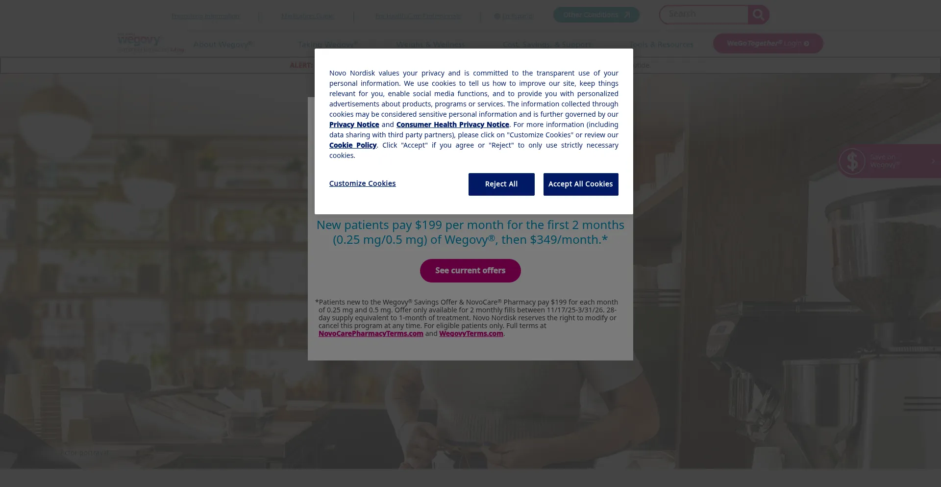 该网站实现符合GDPR或CCPA等隐私法规的cookie同意机制。这表明 wegovy.com 遵守数据保护标准并为用户提供对个人数据收集实践的控制。