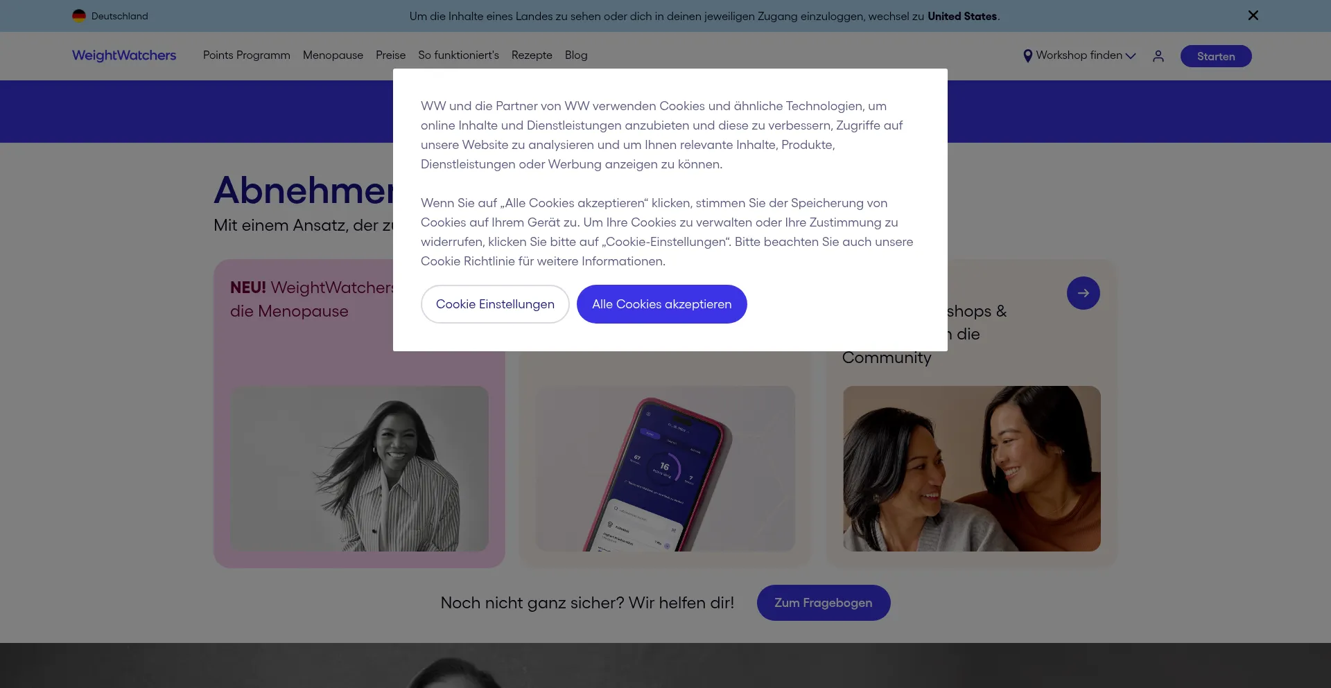 该网站实现符合GDPR或CCPA等隐私法规的cookie同意机制。这表明 weightwatchers.de 遵守数据保护标准并为用户提供对个人数据收集实践的控制。