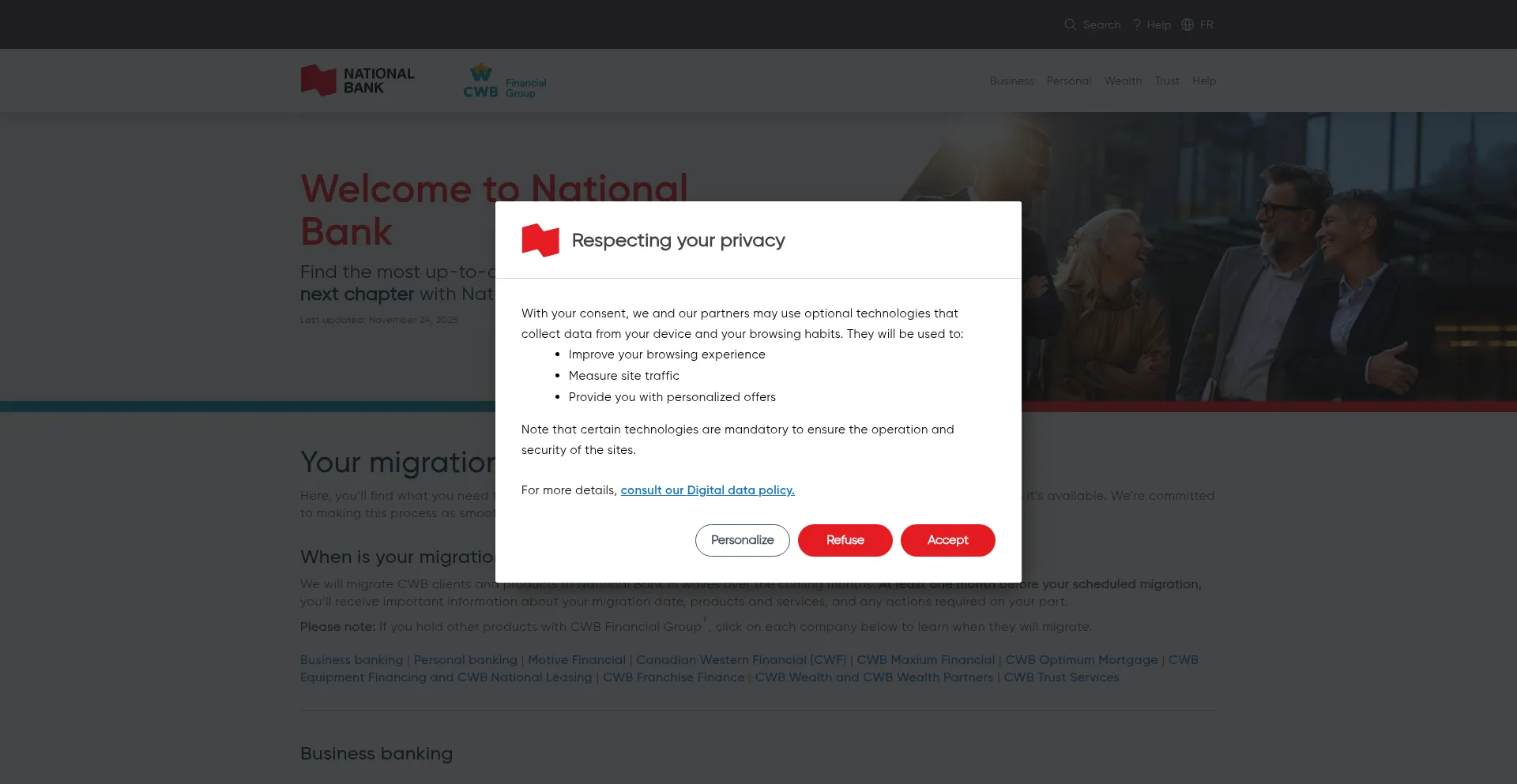 Consult your client migration hub for information related to the acquisition of Canadian Western Bank (CWB) by National Bank of Canada.