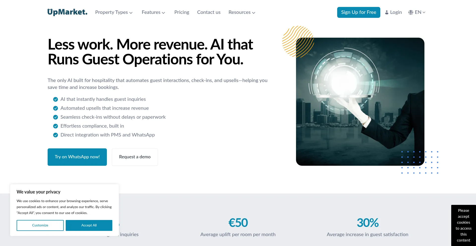 Simplify hospitality operations with UpMarket AI: automate reservations, guest check-ins, streamline WhatsApp communication and increase revenue for hotels and vacation rentals.