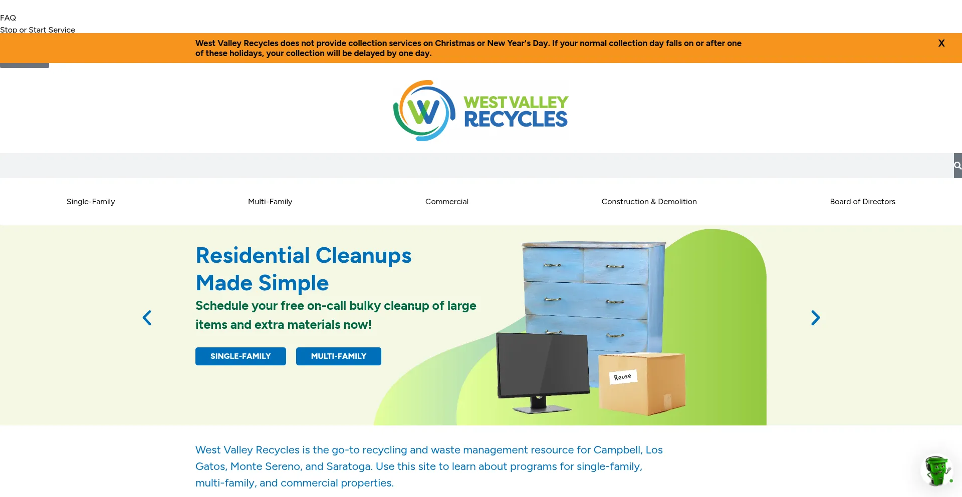 West Valley Recycles does not provide collection services on Christmas or New Year's Day.