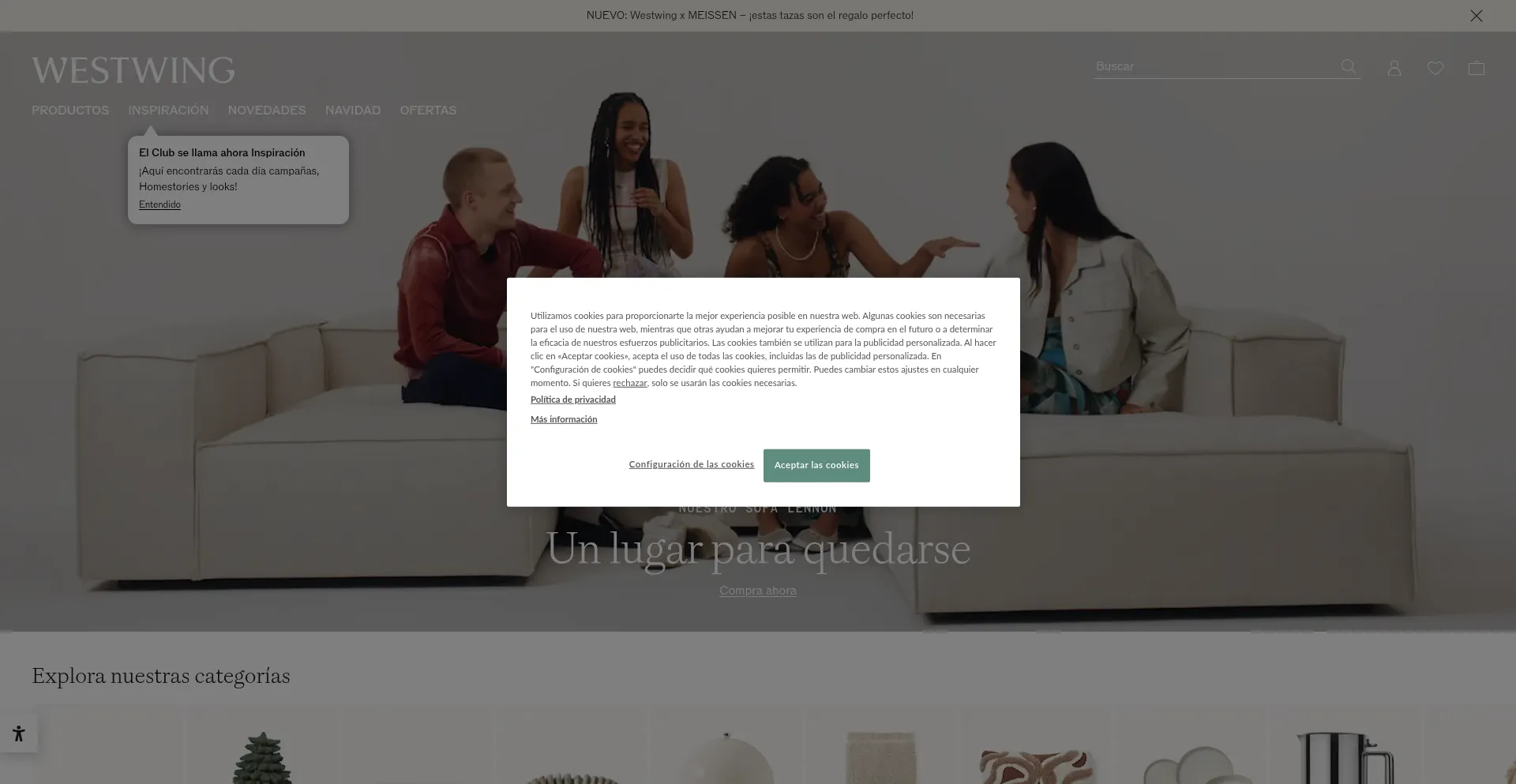 该网站实现符合GDPR或CCPA等隐私法规的cookie同意机制。这表明 westwing.es 遵守数据保护标准并为用户提供对个人数据收集实践的控制。