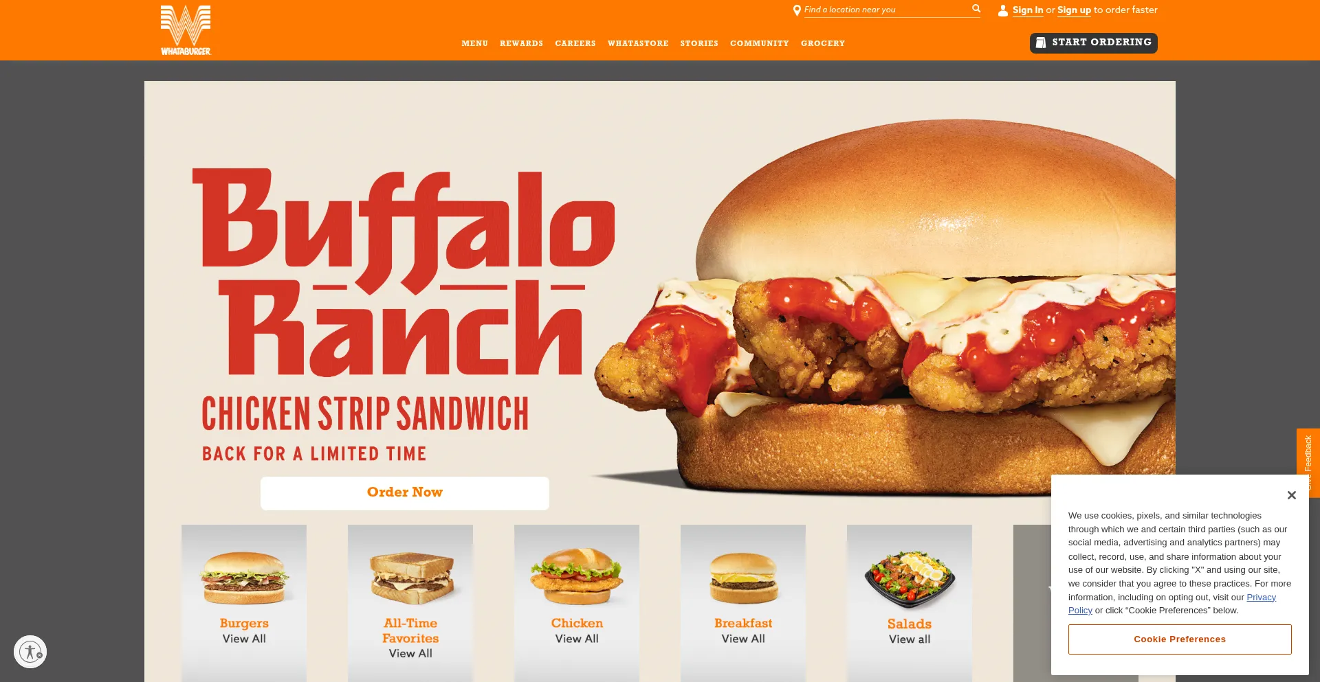 该网站实现符合GDPR或CCPA等隐私法规的cookie同意机制。这表明 whataburger.com 遵守数据保护标准并为用户提供对个人数据收集实践的控制。