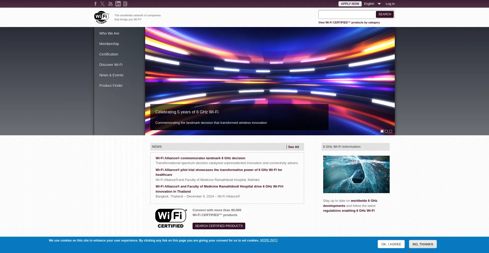 该网站实现符合GDPR或CCPA等隐私法规的cookie同意机制。这表明 wi-fi.org 遵守数据保护标准并为用户提供对个人数据收集实践的控制。