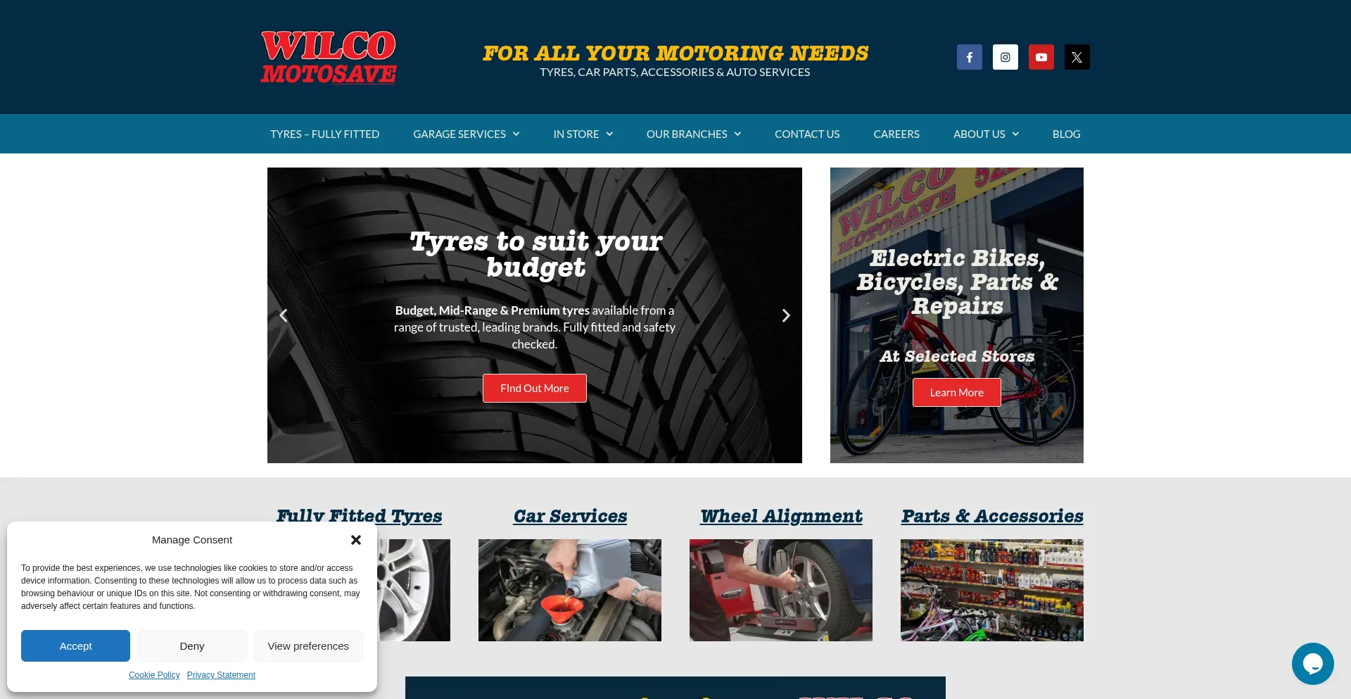 Tyres Fitted, Car Parts and Garage Services. TPMS, Alignment, Batteries, Aircon Regas. Bicycles and E-Bikes. 26 local branches in the North and East Midlands.