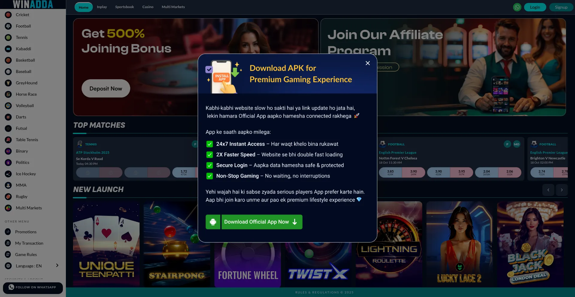 网站 winadda.online 被配置为一个带有移动应用功能的网络应用。用户可以直接将该网站安装到设备的桌面上,以快速访问并享受类似移动应用的体验。