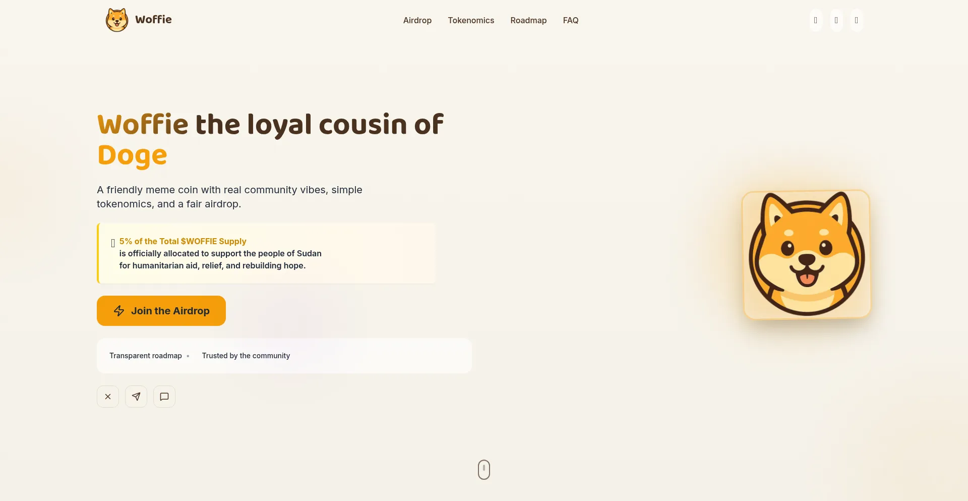 Woffie is the loyal cousin of Doge—optimistic, helpful, and community-first. Join our fair airdrop and earn up to $220 WOFFIE with simple tokenomics and 0% tax.