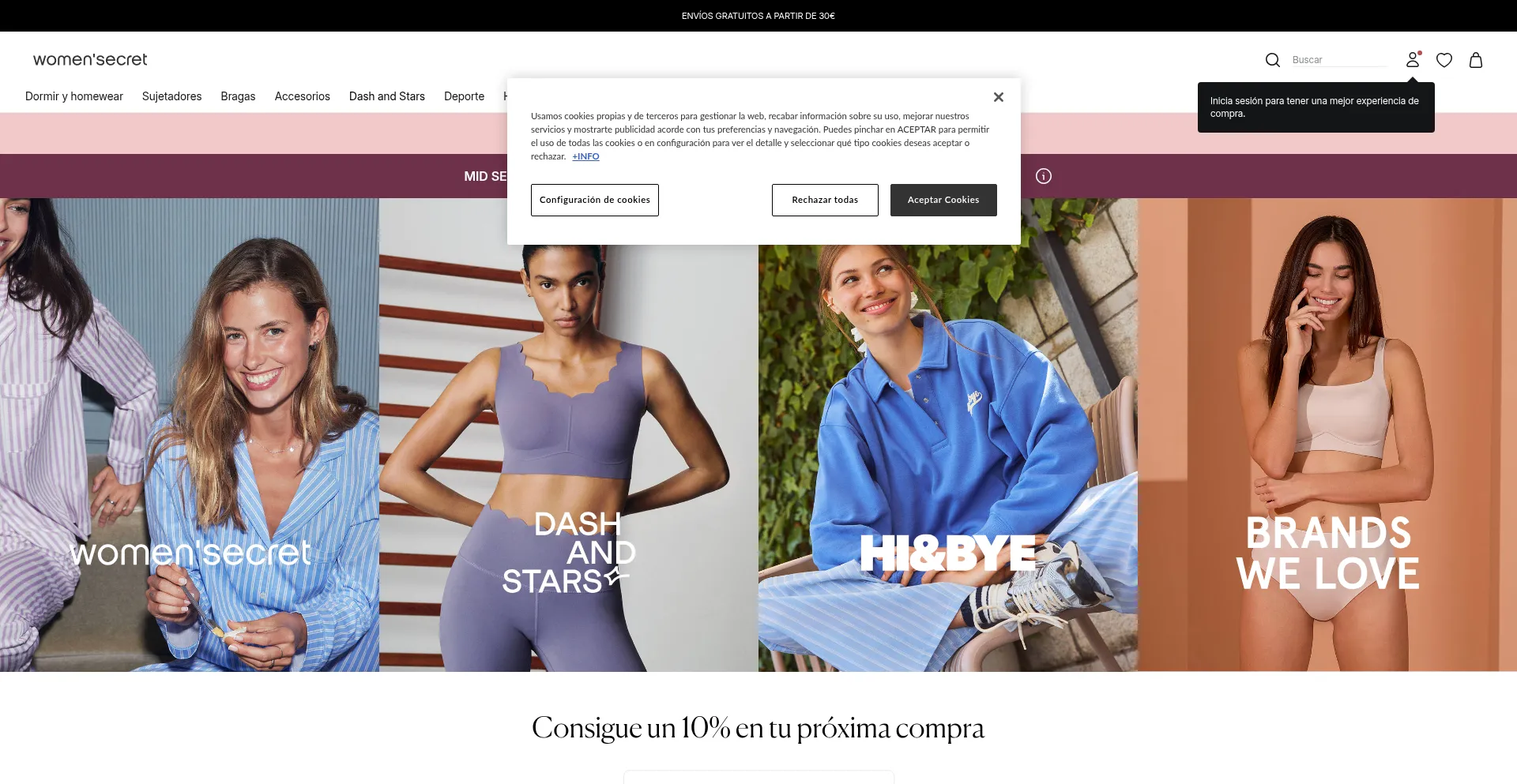 该网站实现符合GDPR或CCPA等隐私法规的cookie同意机制。这表明 womensecret.com 遵守数据保护标准并为用户提供对个人数据收集实践的控制。