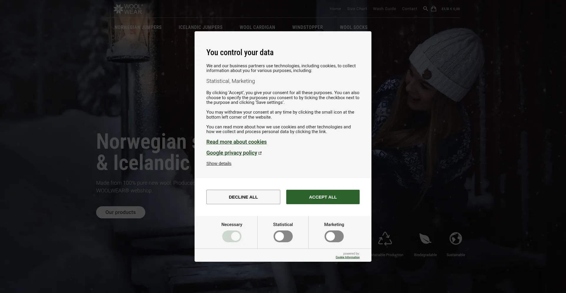 该网站实现符合GDPR或CCPA等隐私法规的cookie同意机制。这表明 wool-wear.com 遵守数据保护标准并为用户提供对个人数据收集实践的控制。