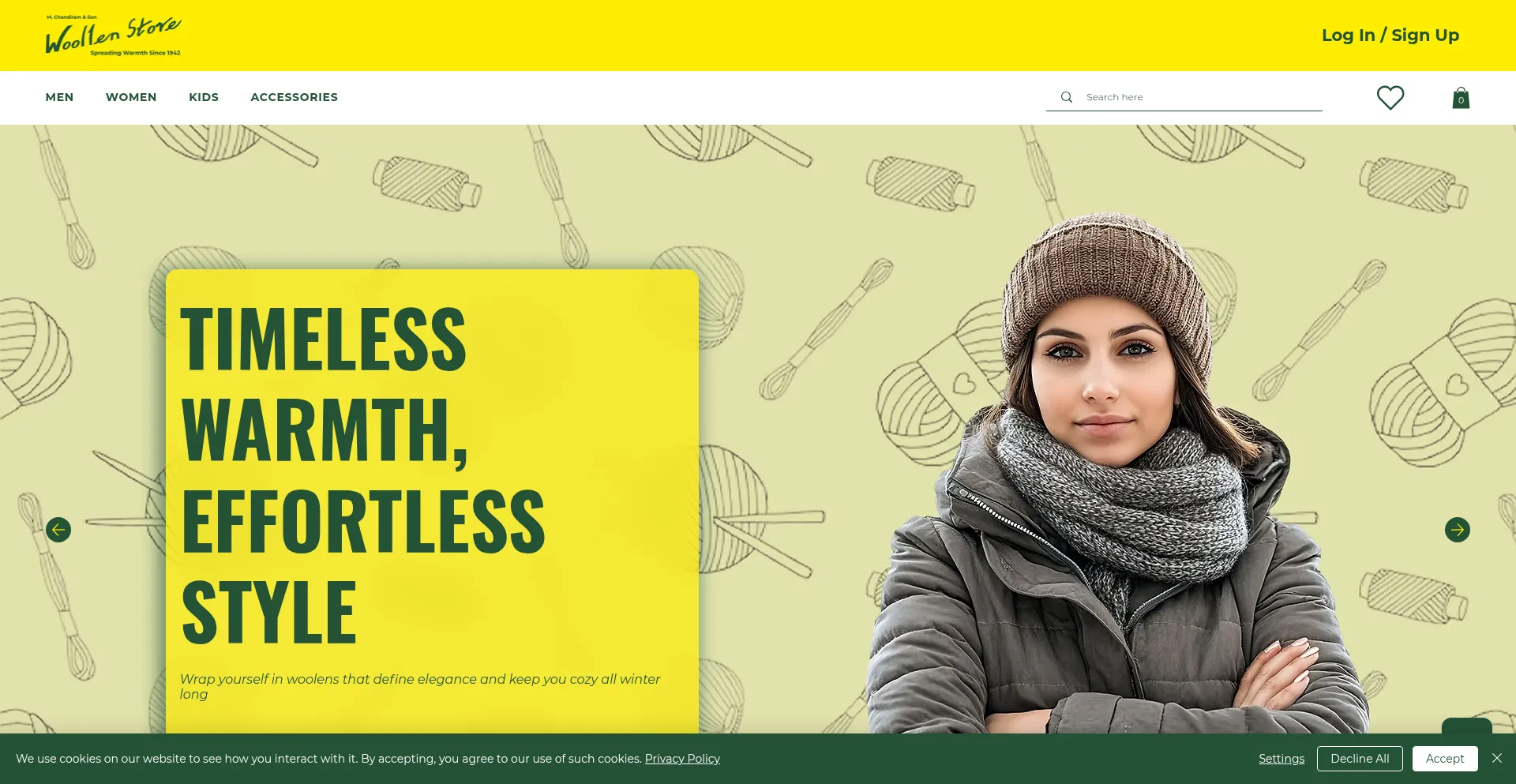 该网站实现符合GDPR或CCPA等隐私法规的cookie同意机制。这表明 woollenstore.com 遵守数据保护标准并为用户提供对个人数据收集实践的控制。