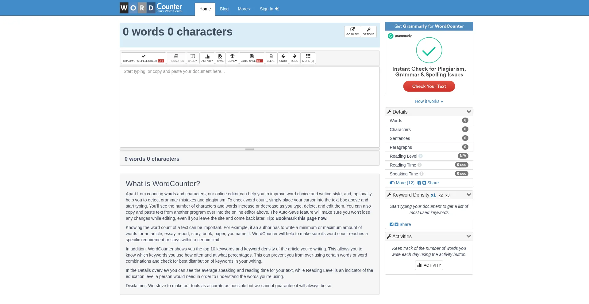Copy and paste your text into the online editor to count its words and characters, check keyword density, and correct writing mistakes. Bookmark it now, it’s free and easy.