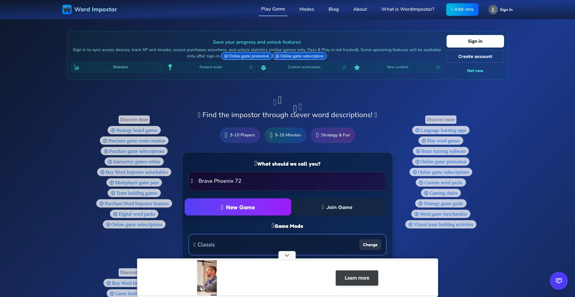 Play Word Impostor - a fun and challenging multiplayer word guessing game. Enjoy party game nights with friends and family. Unmask the impostor and guess the secret word!