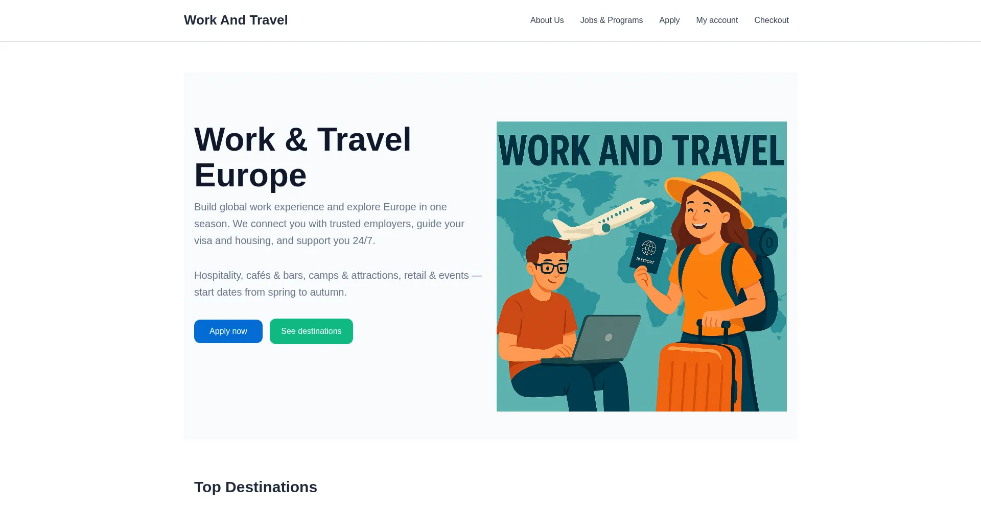 该网站实现数据收集表单,请求个人信息,包括姓名、电子邮件地址、电话号码或其他敏感详细信息。用户应验证 workandtravel.work 的合法性并在提交个人数据前查看隐私政策。