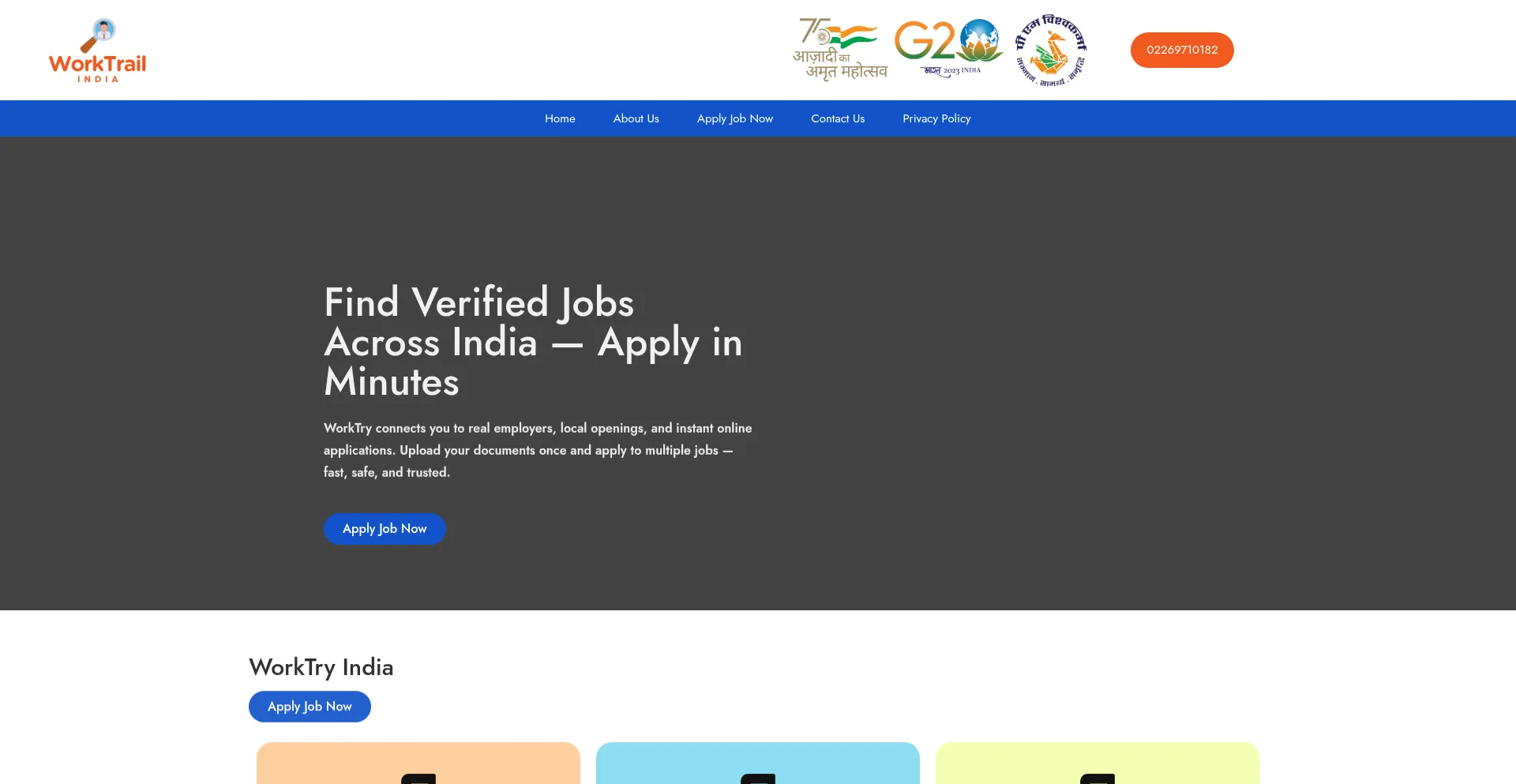 该网站实现数据收集表单,请求个人信息,包括姓名、电子邮件地址、电话号码或其他敏感详细信息。用户应验证 worktry.in 的合法性并在提交个人数据前查看隐私政策。