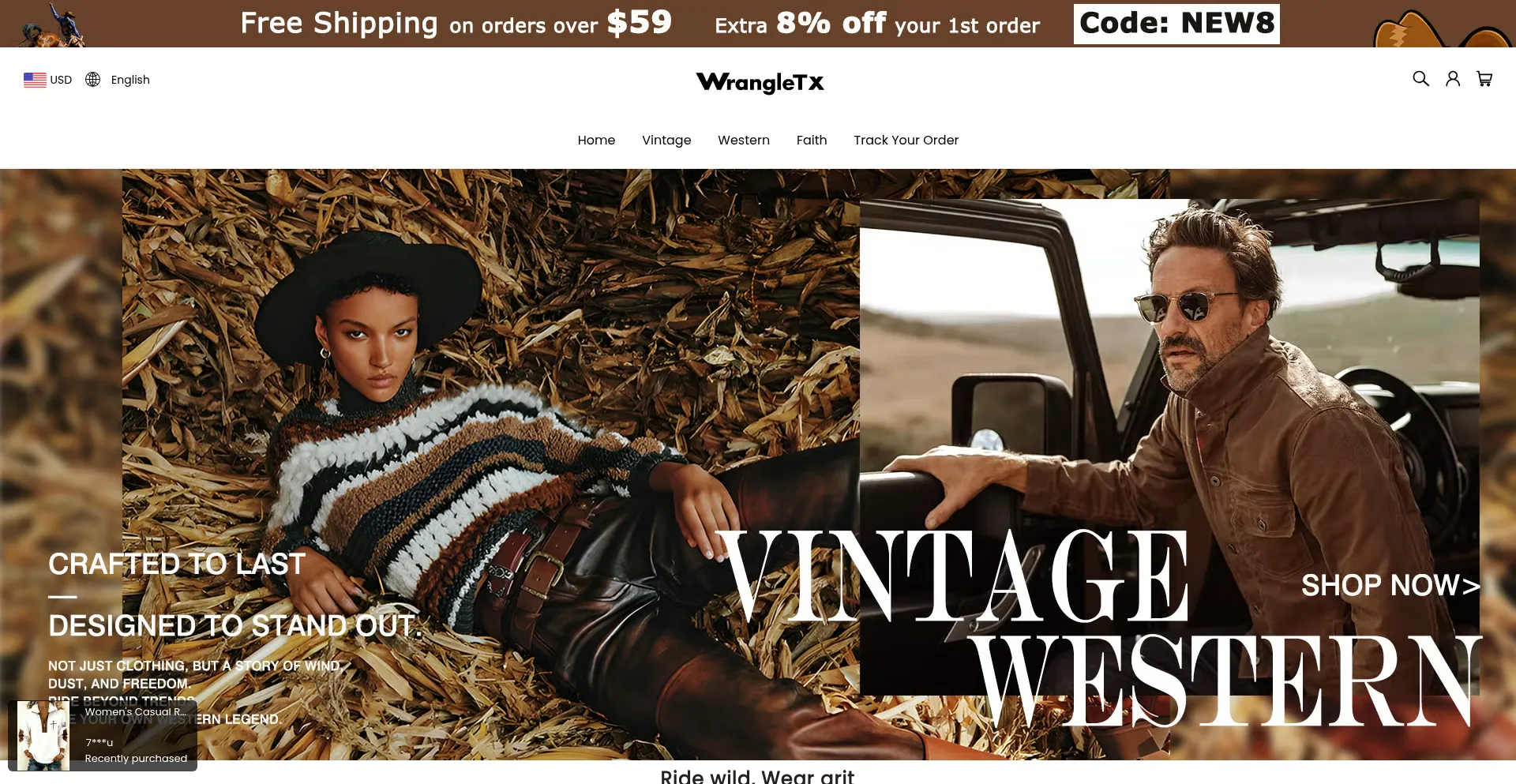 分析表明 wrangletx.com 作为电子商务平台运营,促进商品或服务的在线交易。该网站实现了购物车功能、支付处理系统和产品目录功能,这些是商业零售运营的典型特征。