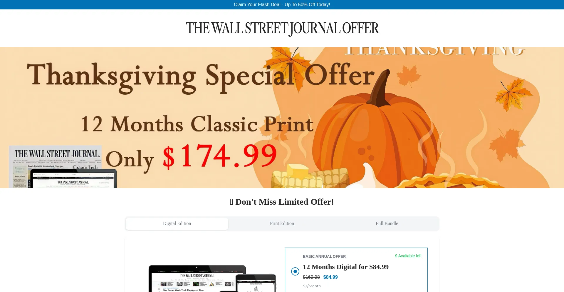 该网站实现数据收集表单,请求个人信息,包括姓名、电子邮件地址、电话号码或其他敏感详细信息。用户应验证 wsj-subscription.com 的合法性并在提交个人数据前查看隐私政策。