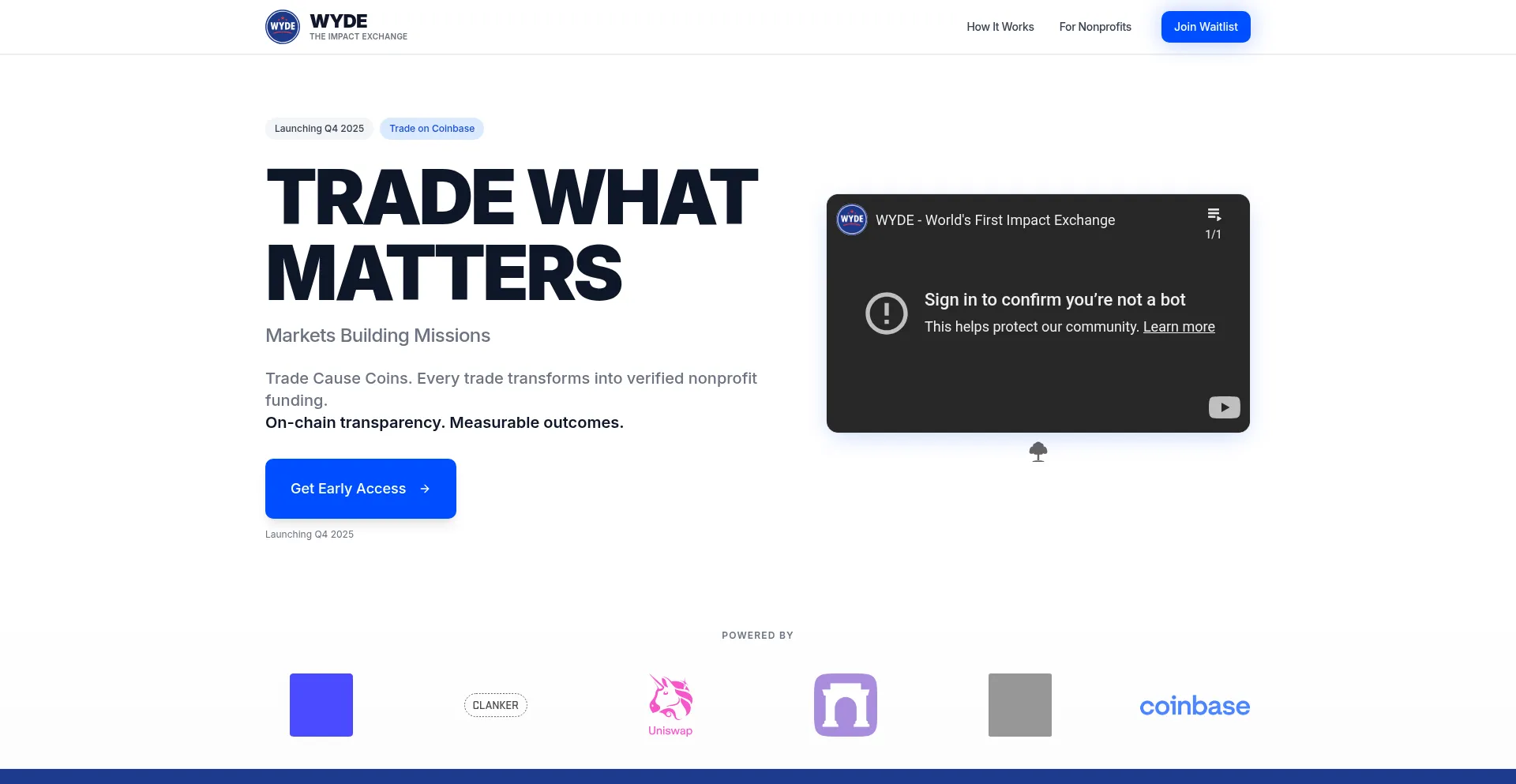 WYDE (Wyoming Decentralized Exchange) - The Impact Exchange. Every trade automatically funds verified nonprofit organizations.