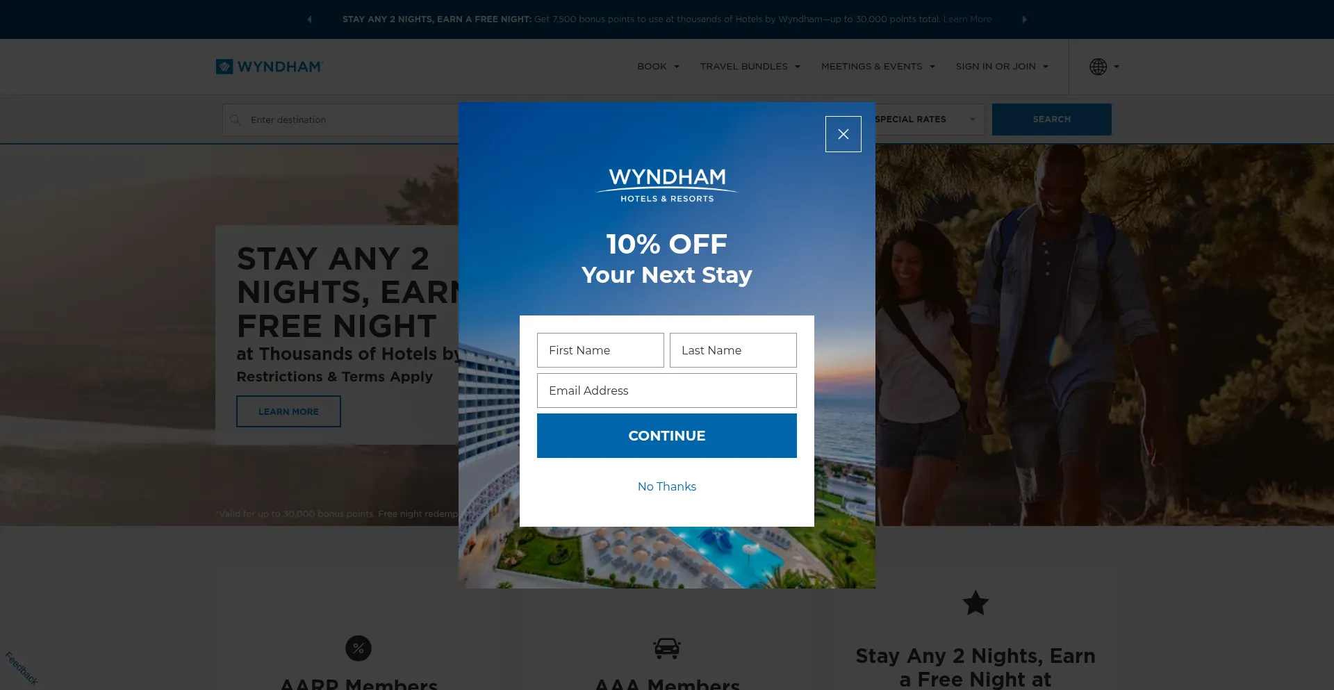 该网站实现数据收集表单,请求个人信息,包括姓名、电子邮件地址、电话号码或其他敏感详细信息。用户应验证 wyndham.com 的合法性并在提交个人数据前查看隐私政策。