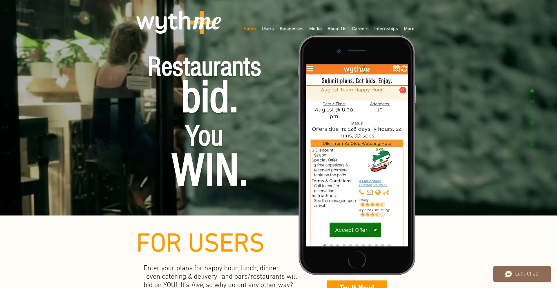 Restaurants bid. You win. WythMe is a free app that gets bars & restaurants bidding on you! Simply enter your plans & businesses bid on you!