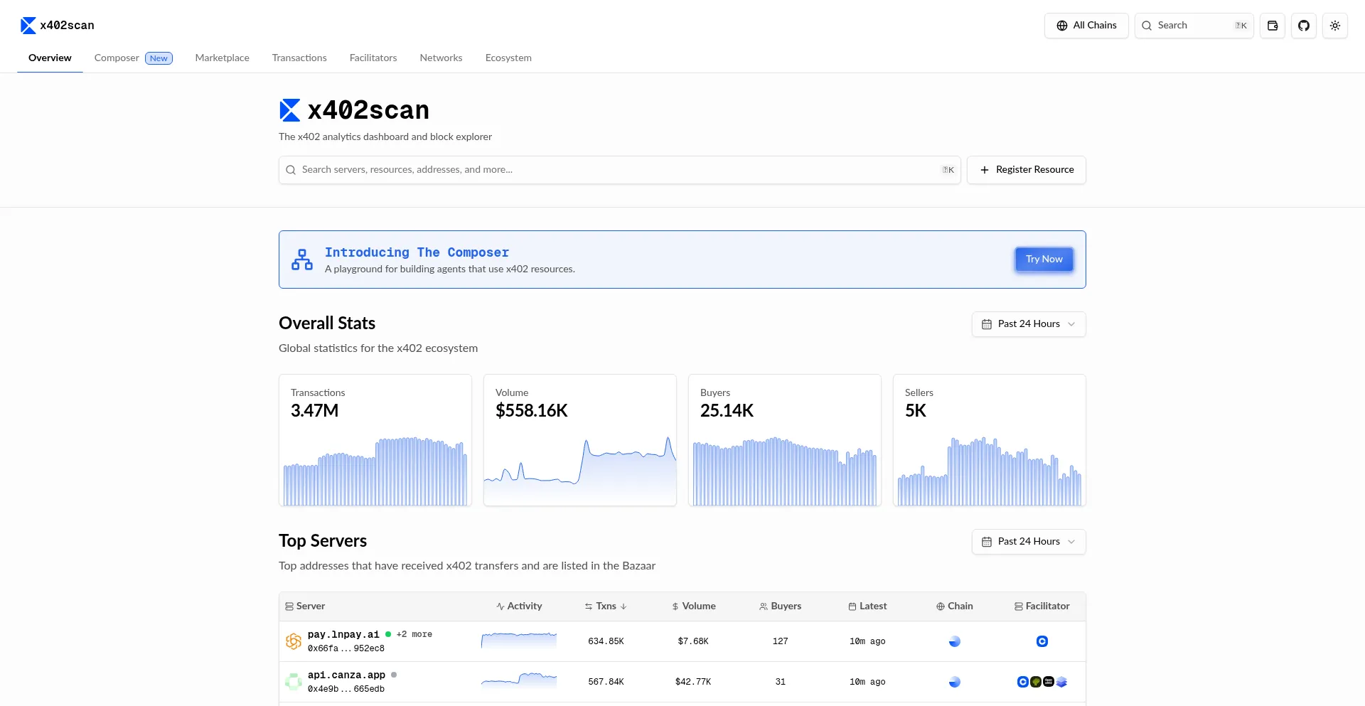 Explore the x402 ecosystem. View transactions, sellers, origins and resources. Explore the future of agentic commerce.