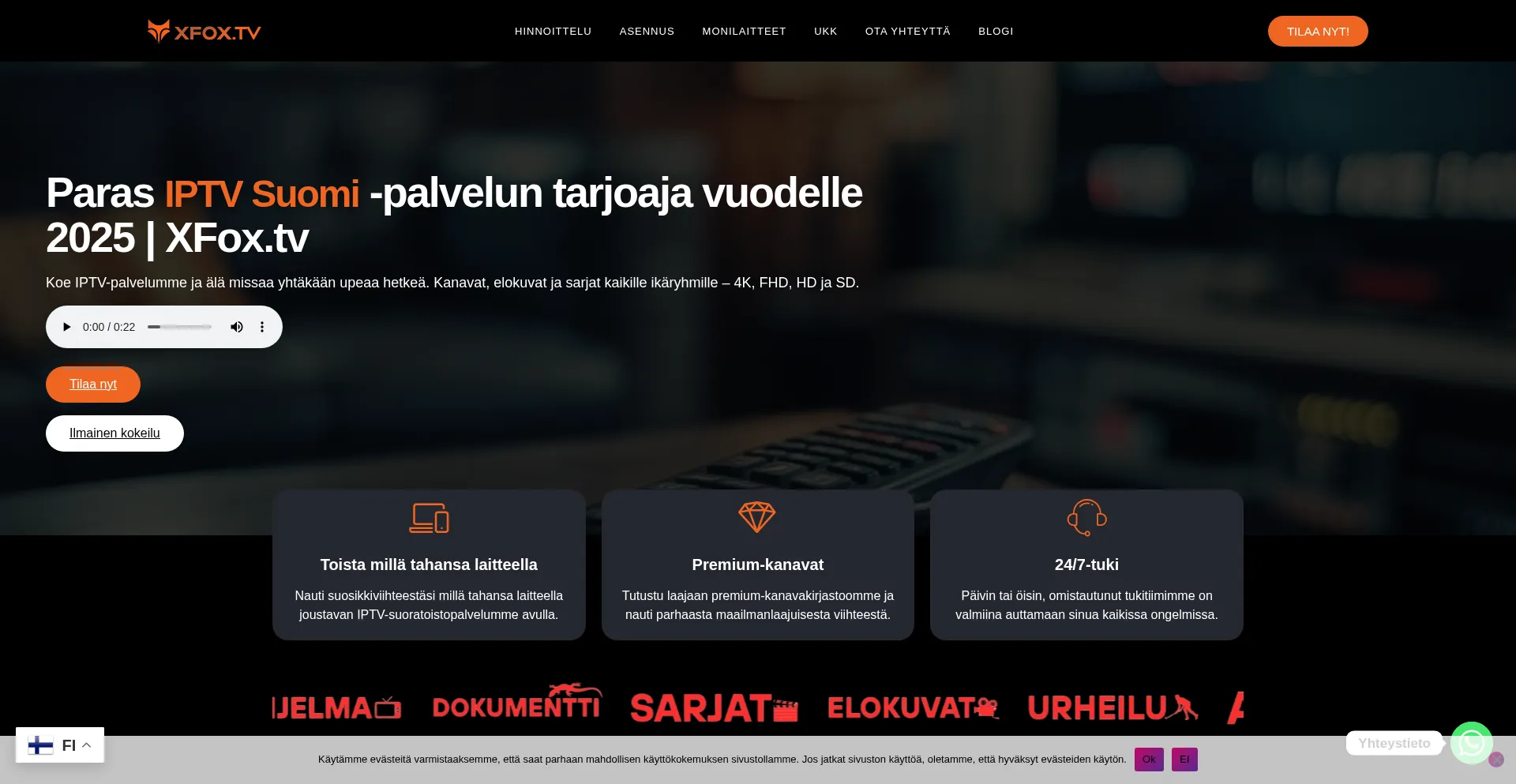 Koe XFox TV:n IPTV Suomi -palvelu! Yli 22,000 live-kanavaa ja 120,000+ elokuvia ja sarjoja kaikilla kielillä. Toimii kaikilla laitteilla, 24/7 tuki ja 7 päivän rahat takaisin...