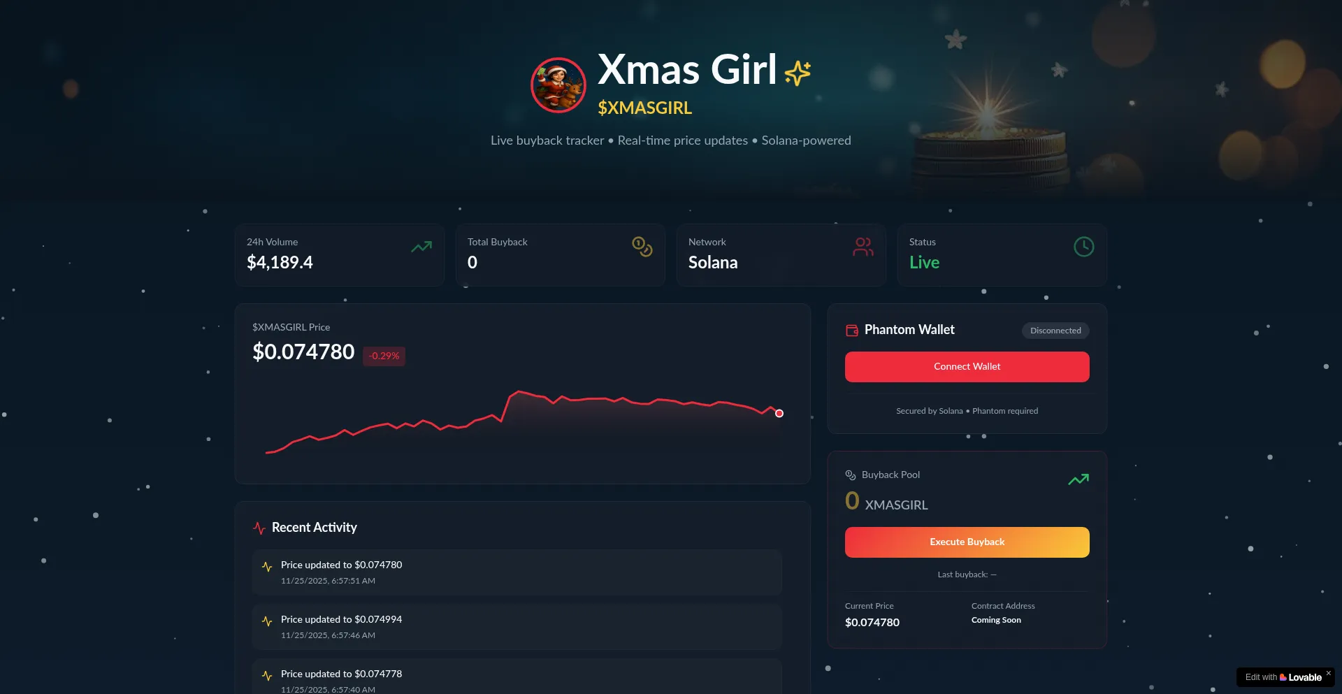 Real-time Xmas Girl ($XMASGIRL) buyback tracker. Live price updates, wallet integration, and transparent buyback execution on Solana.