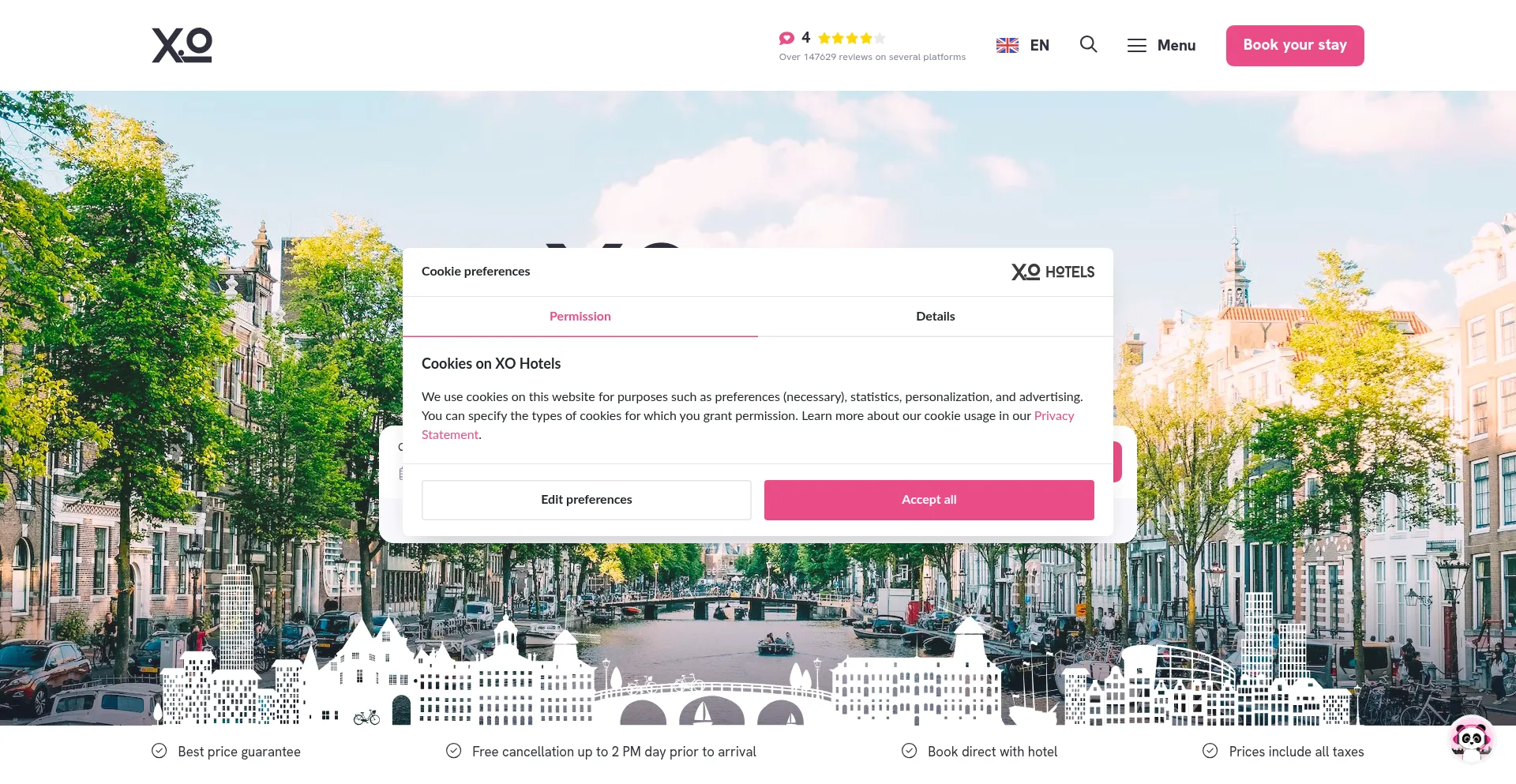 该网站实现符合GDPR或CCPA等隐私法规的cookie同意机制。这表明 xohotels.com 遵守数据保护标准并为用户提供对个人数据收集实践的控制。
