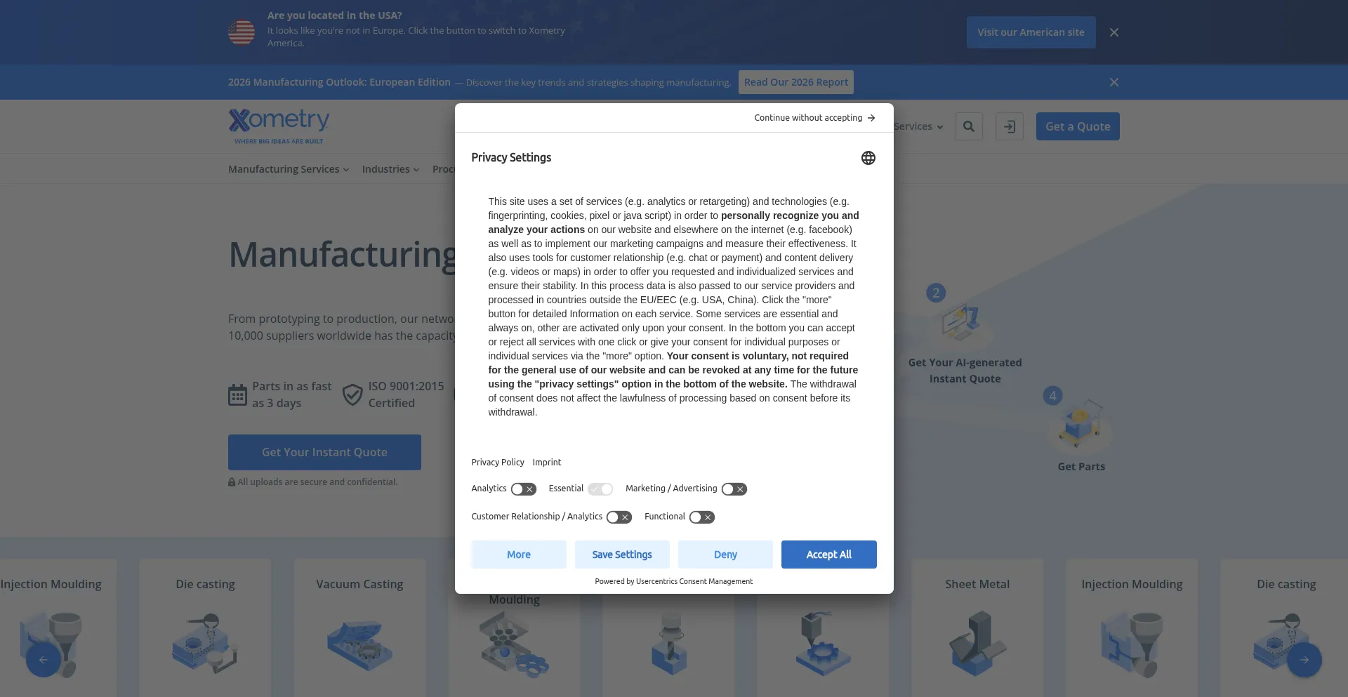 该网站实现符合GDPR或CCPA等隐私法规的cookie同意机制。这表明 xometry.eu 遵守数据保护标准并为用户提供对个人数据收集实践的控制。