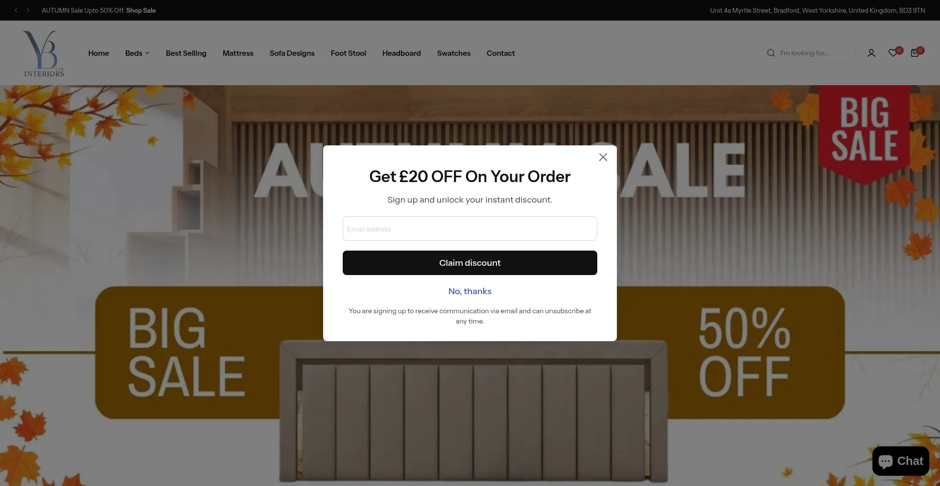 该网站实现数据收集表单,请求个人信息,包括姓名、电子邮件地址、电话号码或其他敏感详细信息。用户应验证 ybinteriorsltd.co.uk 的合法性并在提交个人数据前查看隐私政策。