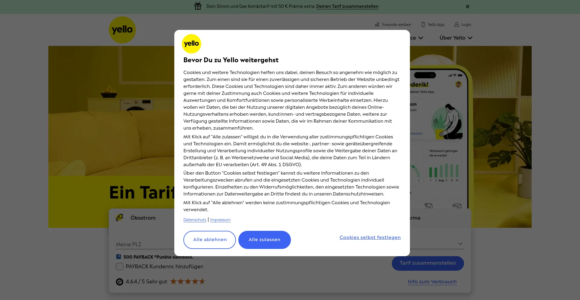 该网站实现符合GDPR或CCPA等隐私法规的cookie同意机制。这表明 yello.de 遵守数据保护标准并为用户提供对个人数据收集实践的控制。