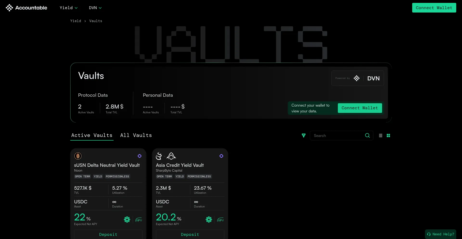Access live, verifiable yield opportunities powered by Accountable’s Data Verification Network (DVN). Every strategy is backed by cryptographic proofs you can trust.