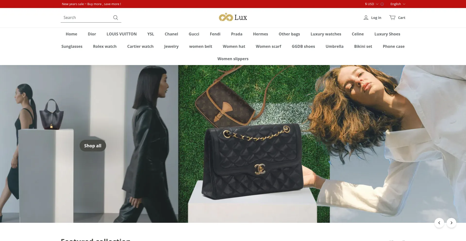 该网站展示奢侈品牌名称或高价值产品。这可能表明潜在的假冒商品或未经授权的品牌使用,特别是如果该网站缺乏官方经销商授权。在评估真实性时请格外谨慎。