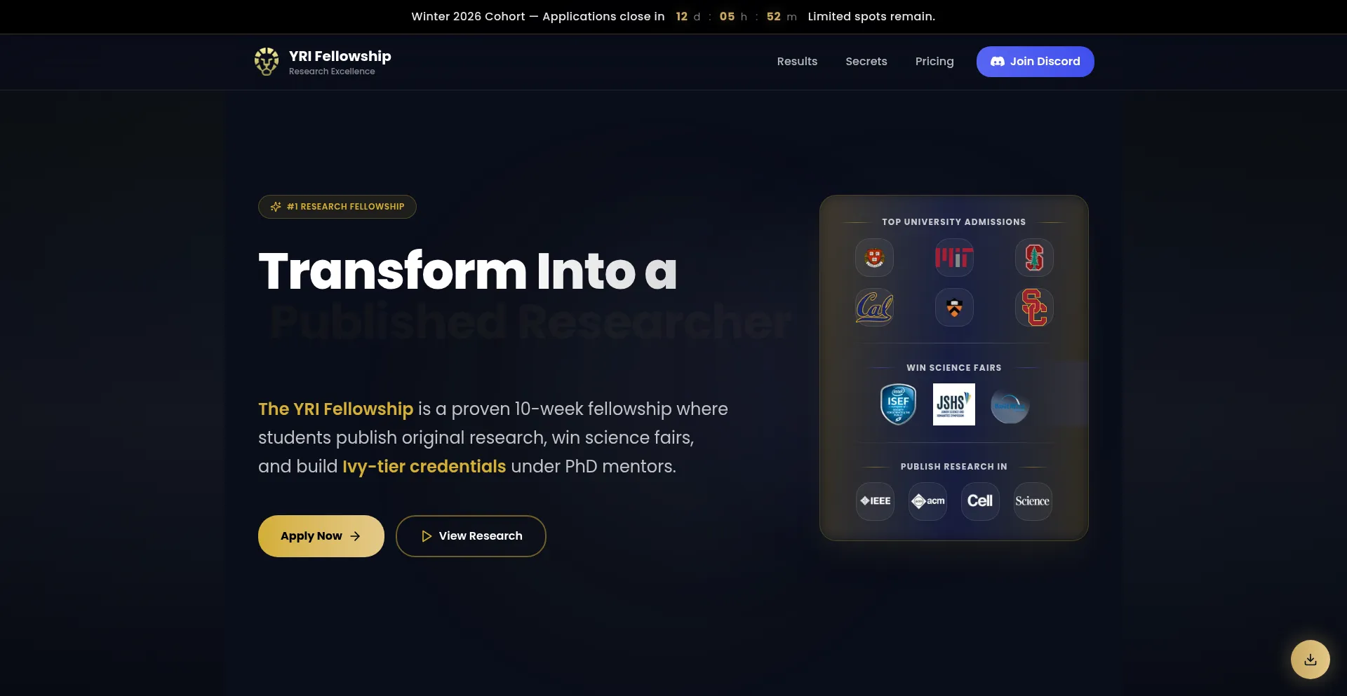 YRI (YRI Fellowship) is the premier research mentorship program helping high school students publish research papers, win science fairs like ISEF, and strengthen Ivy League admi...
