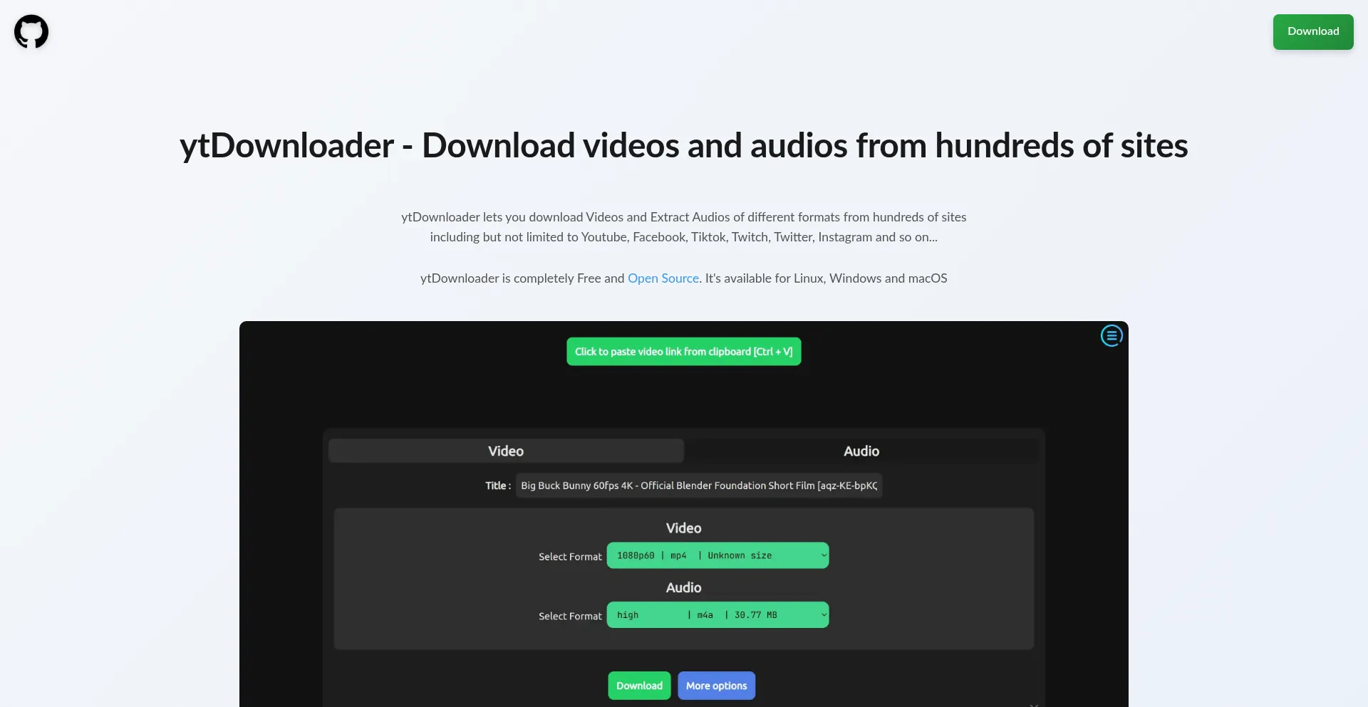 ytDownloader is a video downloader that lets you download videos and audios from several sites like Youtube, Facebook, Tiktok, Twitch, Instagram, Twitter and more...